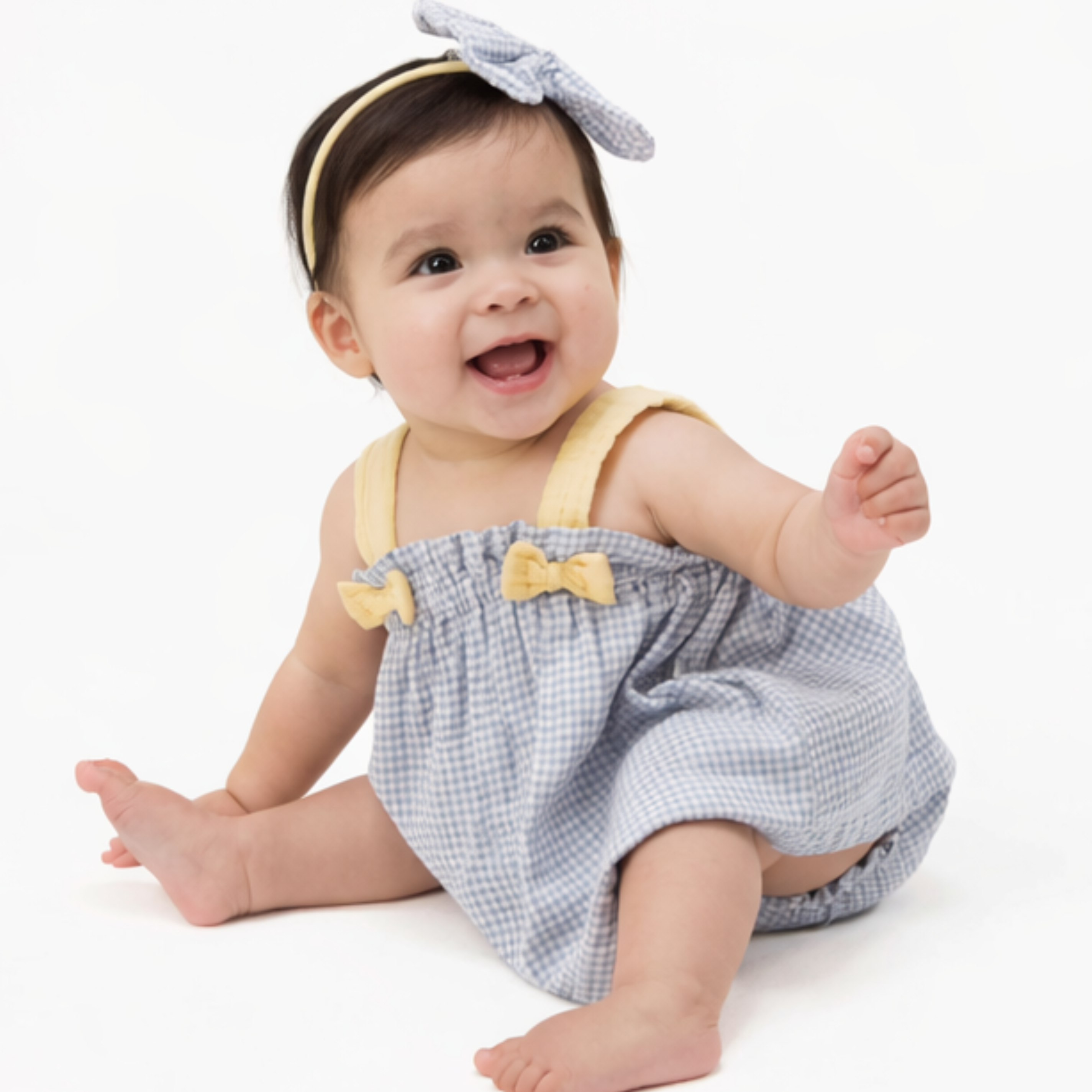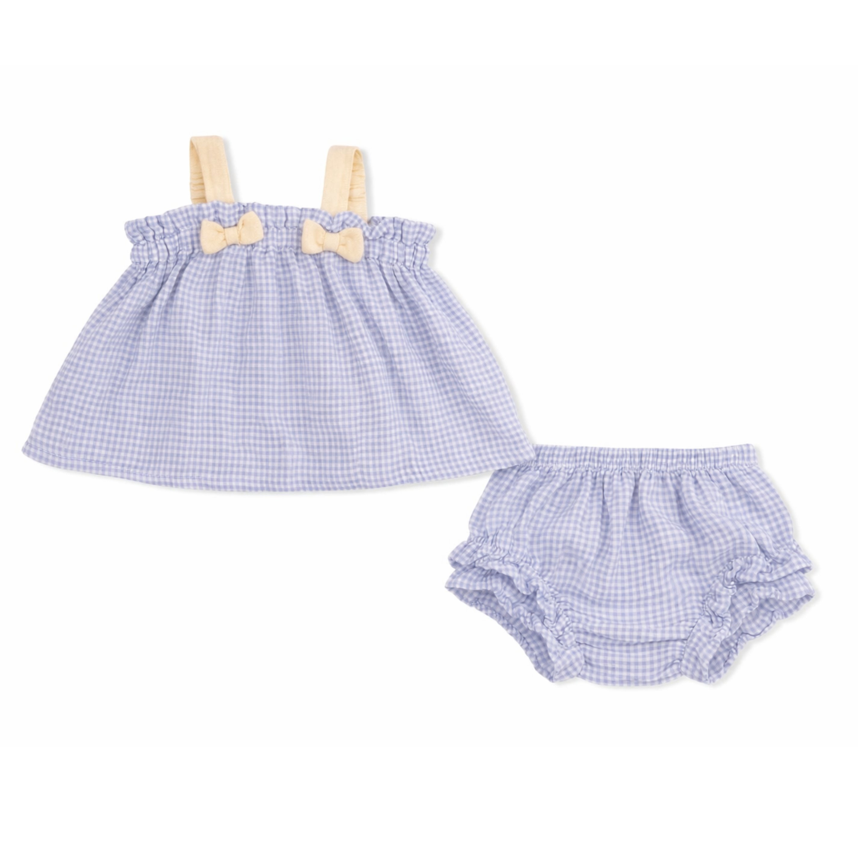 Micro Gingham Blue Blizzard Top with Bows and Ruffle Leg Bloomer