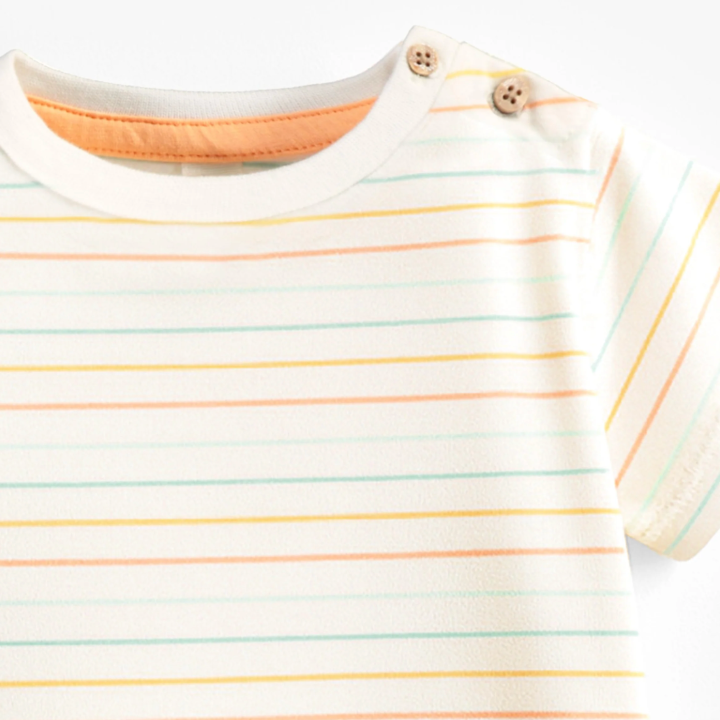 Cream T-shirt with colorful stripes for an adorable, easy-to-match style. Features short sleeves, a round neckline, and buttons at the shoulder to simplify dressing. Made from stretch cotton jersey in a regular fit for maximum comfort.