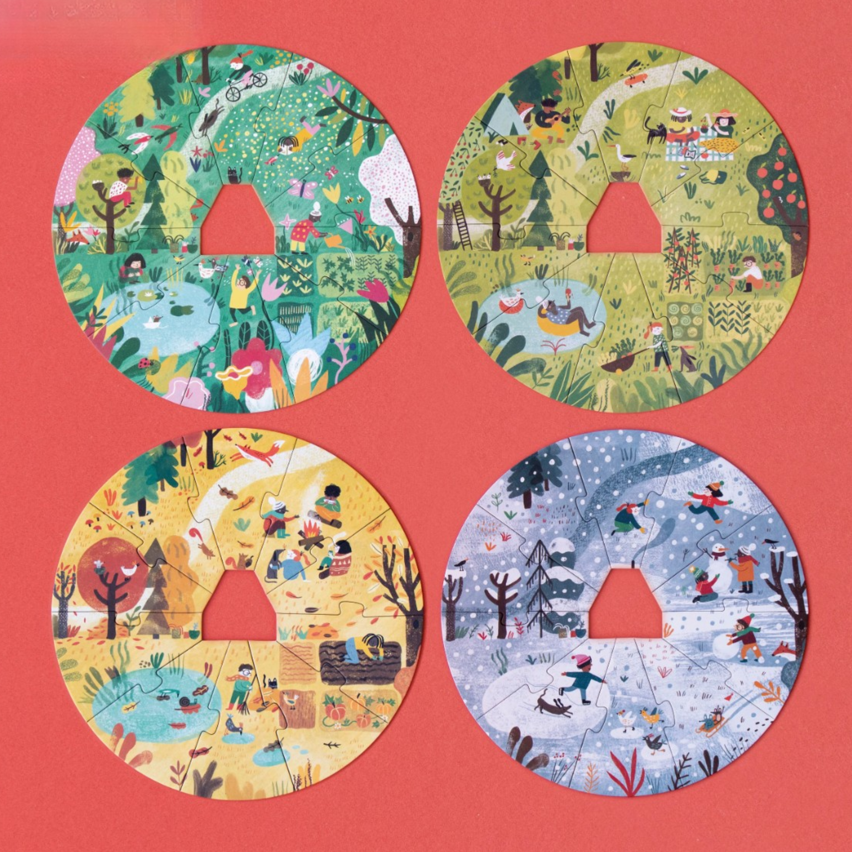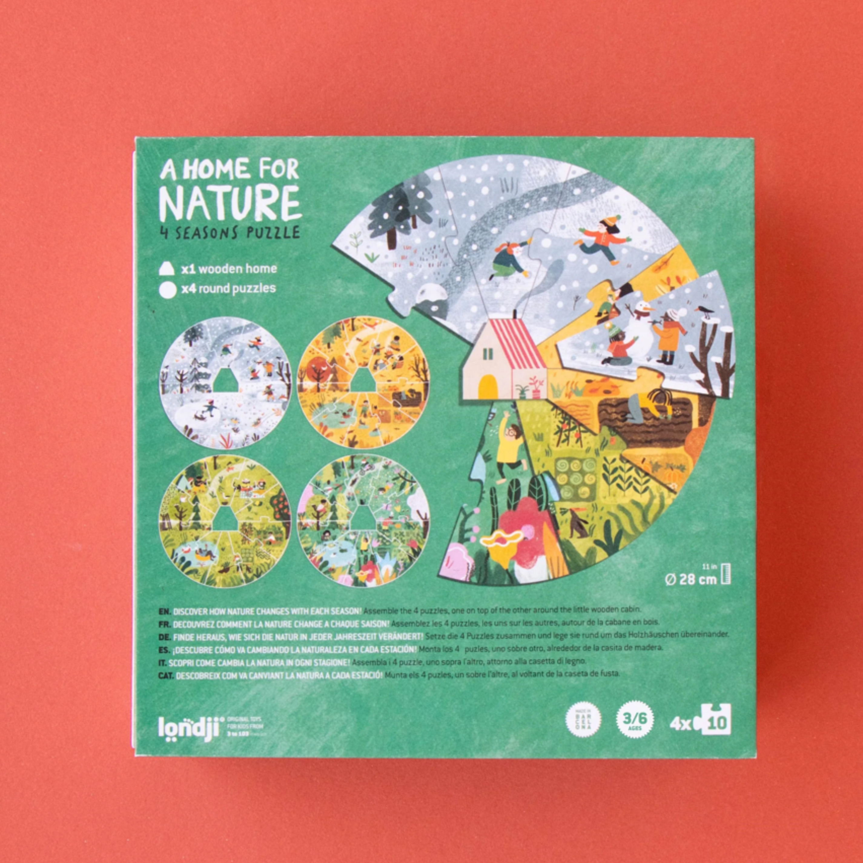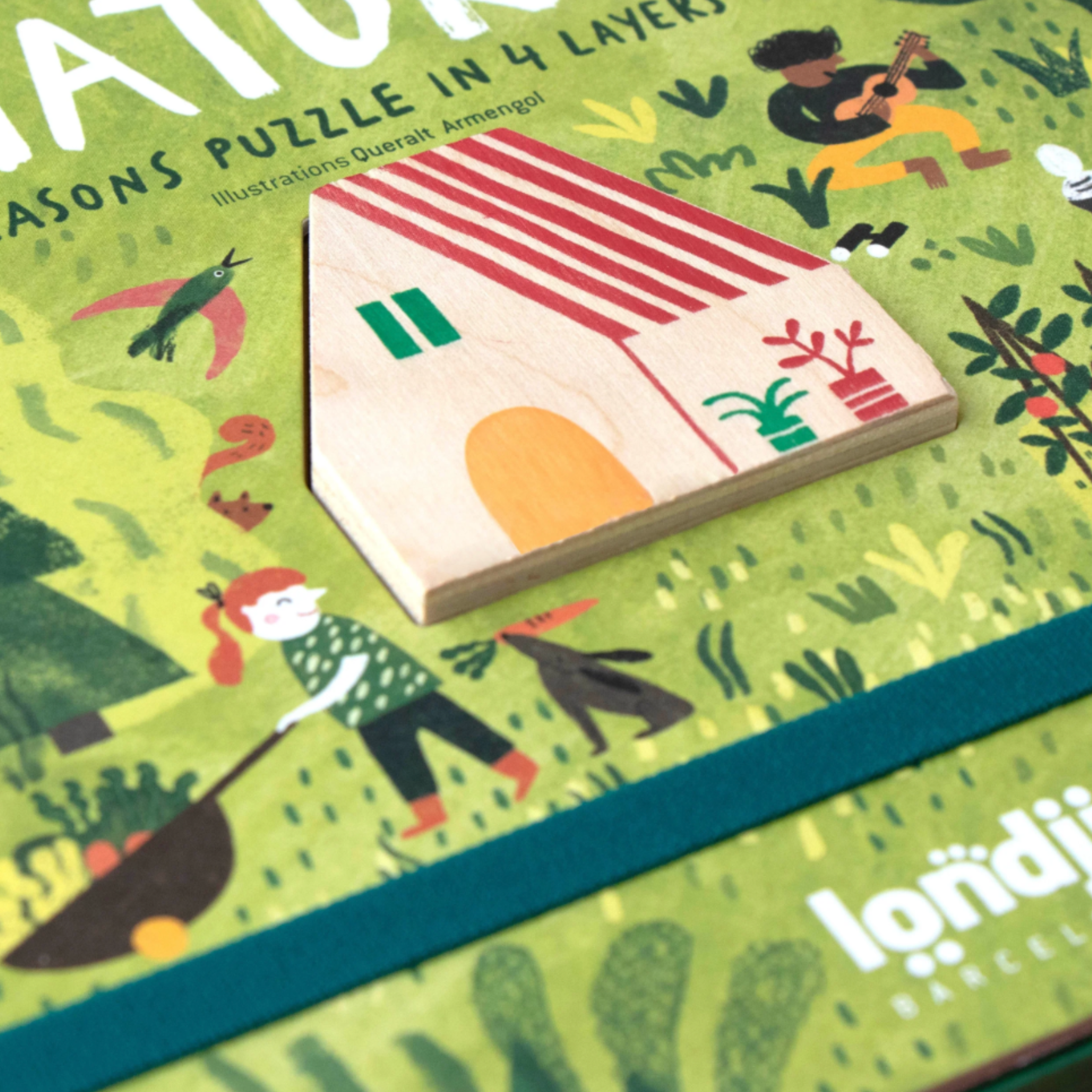 DISCOVER HOW NATURE CHANGES WITH EACH SEASON! Assemble the 4 puzzles, one on top of the other around the little wooden cabin.