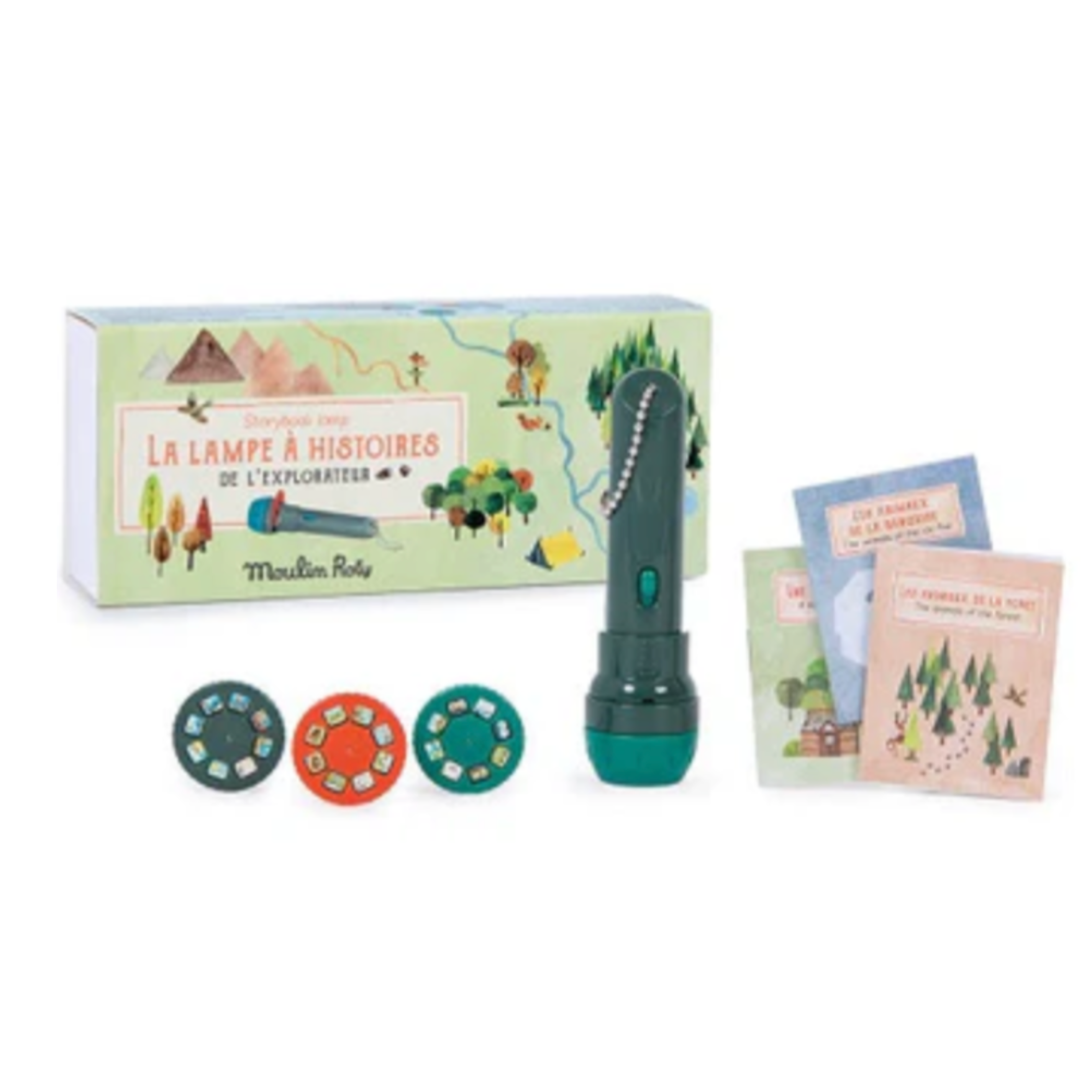 La lampe a histoires de la collection L'explorateur par Moulin Roty est a projeter au mur grace a ses trois disques comprenant 8 images aux illustrations poetiques. Inventez de merveilleuses histoires en pleine nature et apprenez le nom des animaux en francais/anglais grace a ses 3 mini livres inclus.