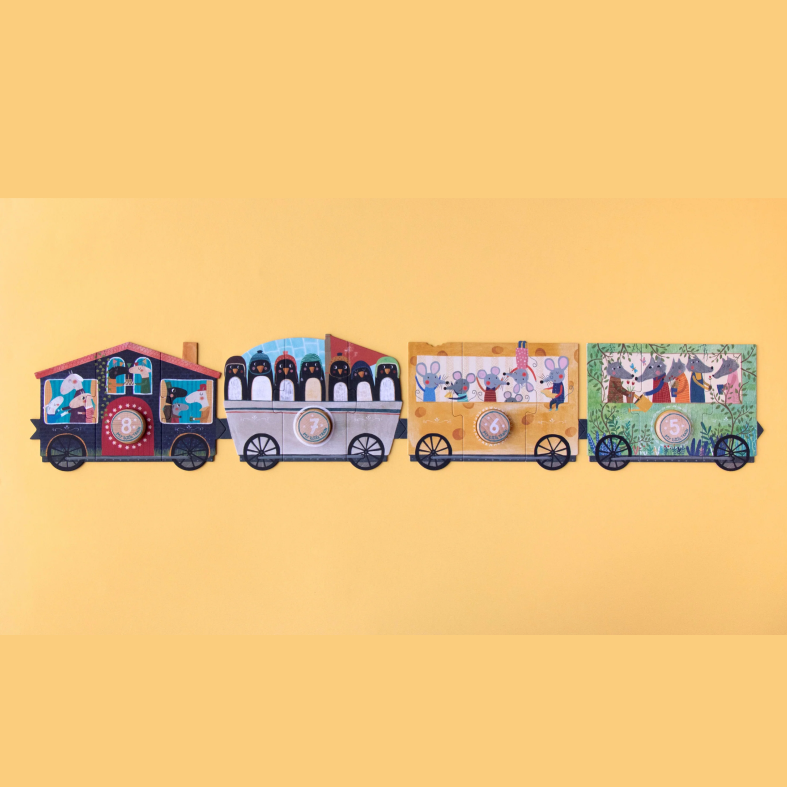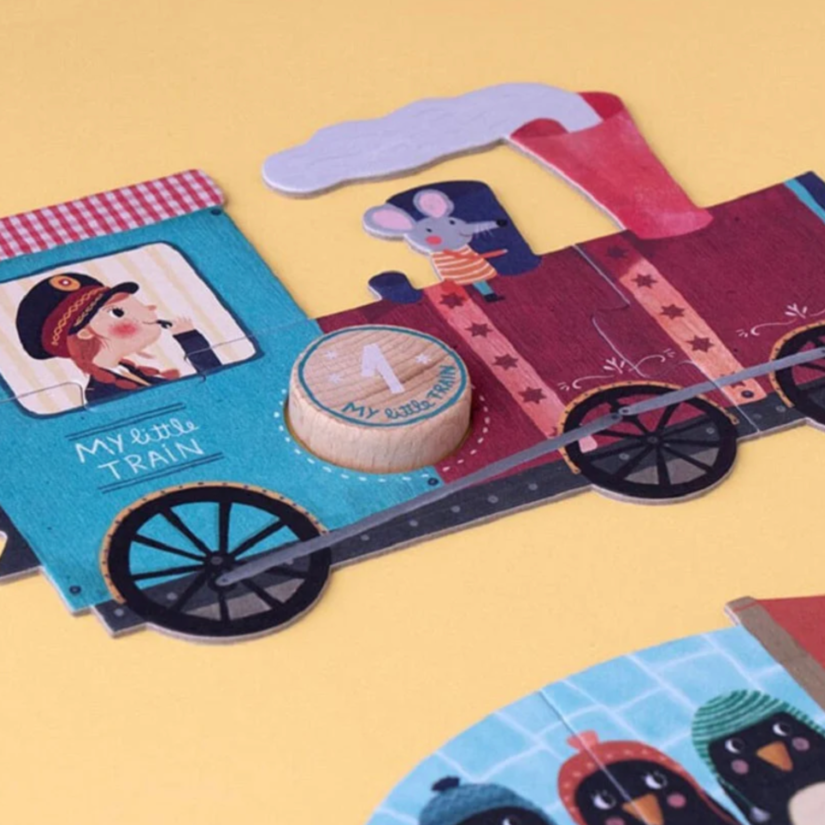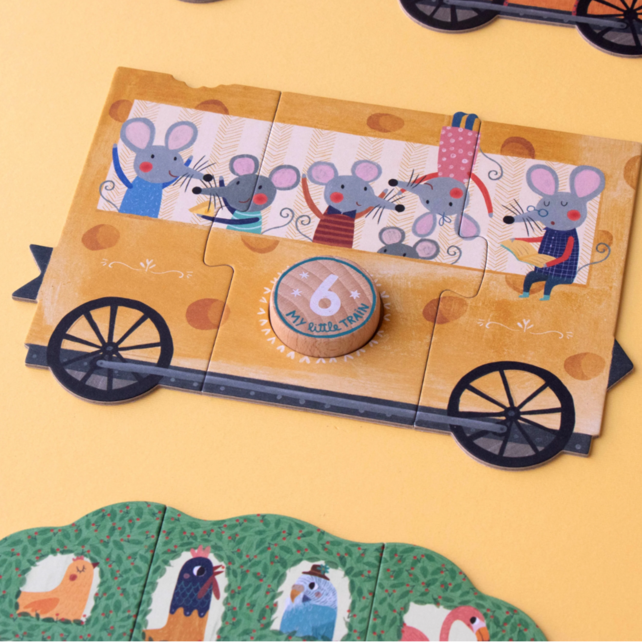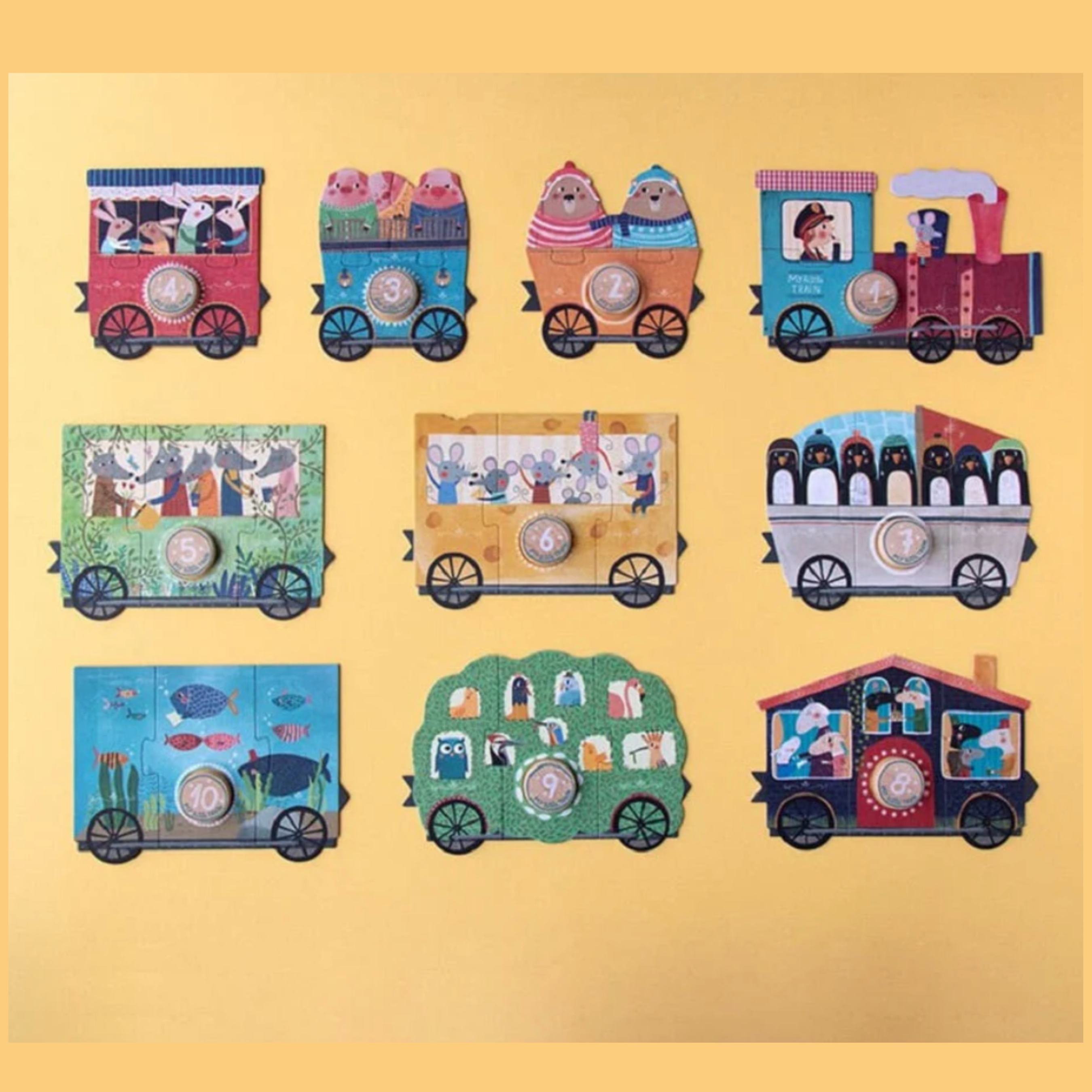 ALL ABOARD! Assemble the 10 puzzles and fit the wooden pieces from 1 to 10 into them.