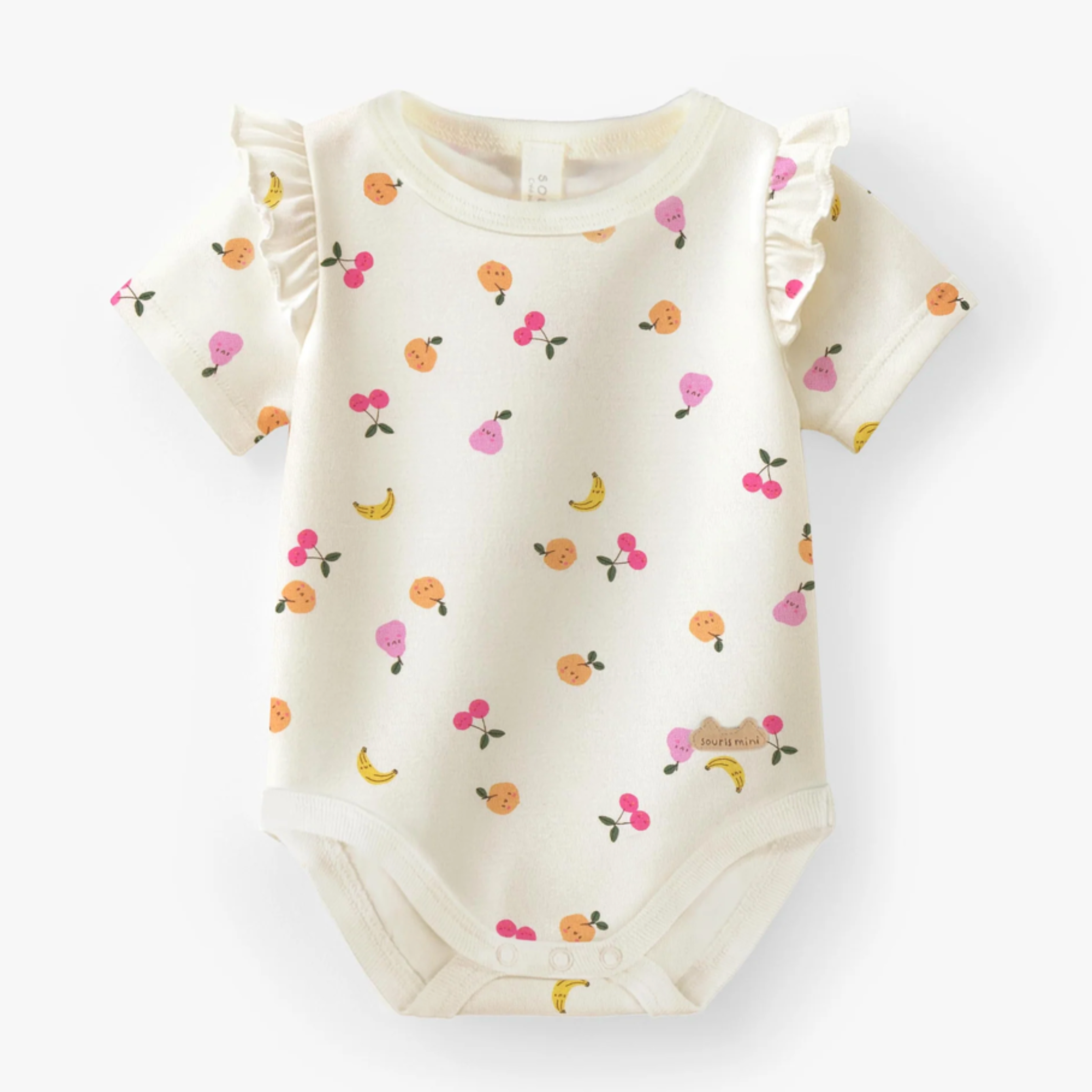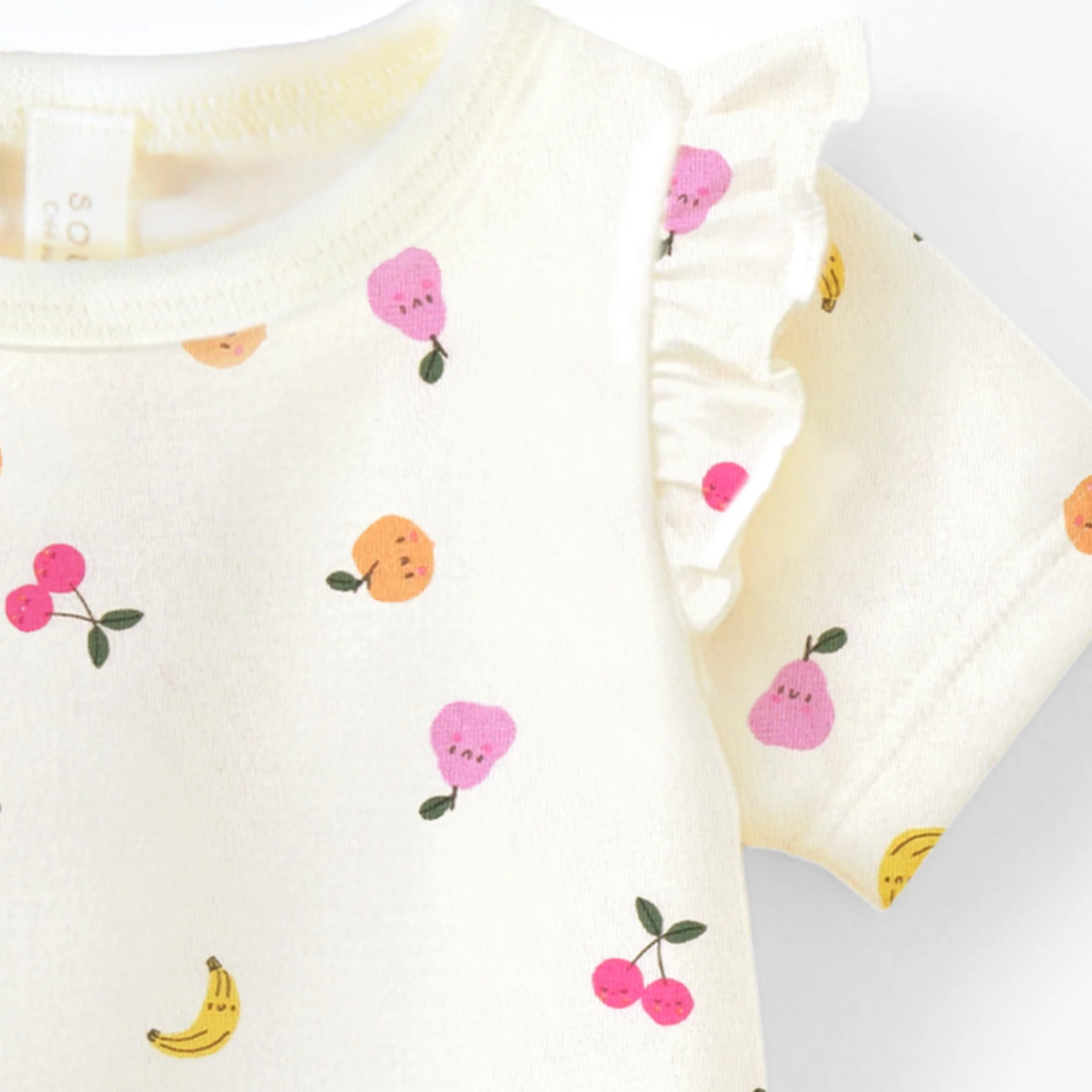 Cream bodysuit with fruit all over print for an adorable look. Features short sleeves with ruffles and a round neckline. Includes snap buttons at the inseam for easy dressing. Made from comfortable stretch jersey in a slim fit.