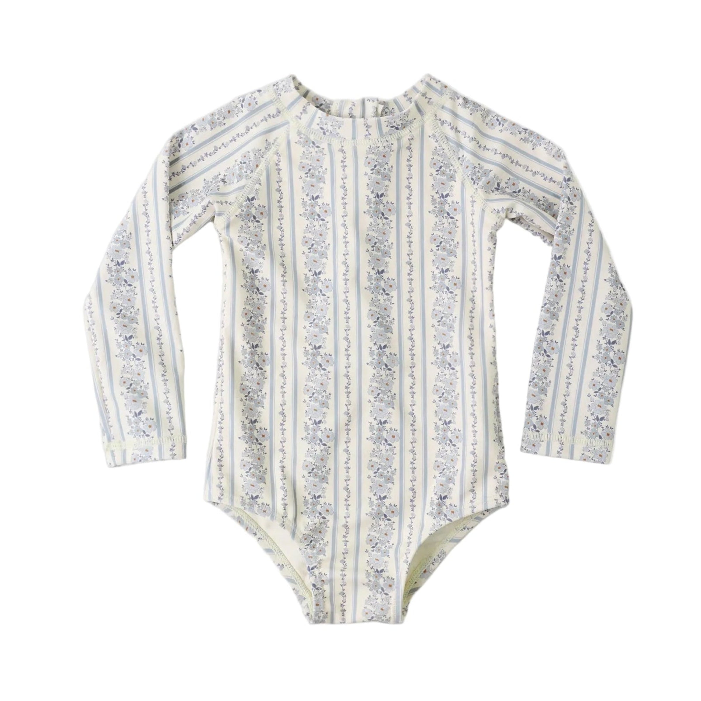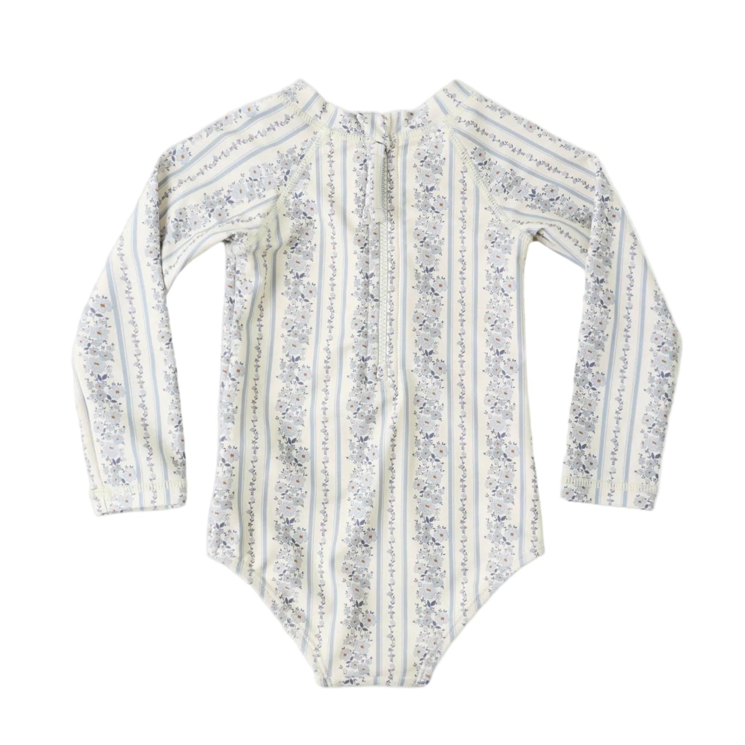 Dive into summer with the Delphine Rashguard One-Piece, where sun protection meets adorable style! This one-piece features a charming blue floral print on a natural backdrop—the perfect coastal-inspired look for beach days and pool parties. The convenient back zipper makes getting in and out a breeze, while UPF 50+ protection shields your little one from harmful rays. Crafted from eco-friendly recycled polyester blended with stretchy elastane, it's as kind to the planet as it is comfortable to wear. Machine wash cold and hang dry for lasting durability.