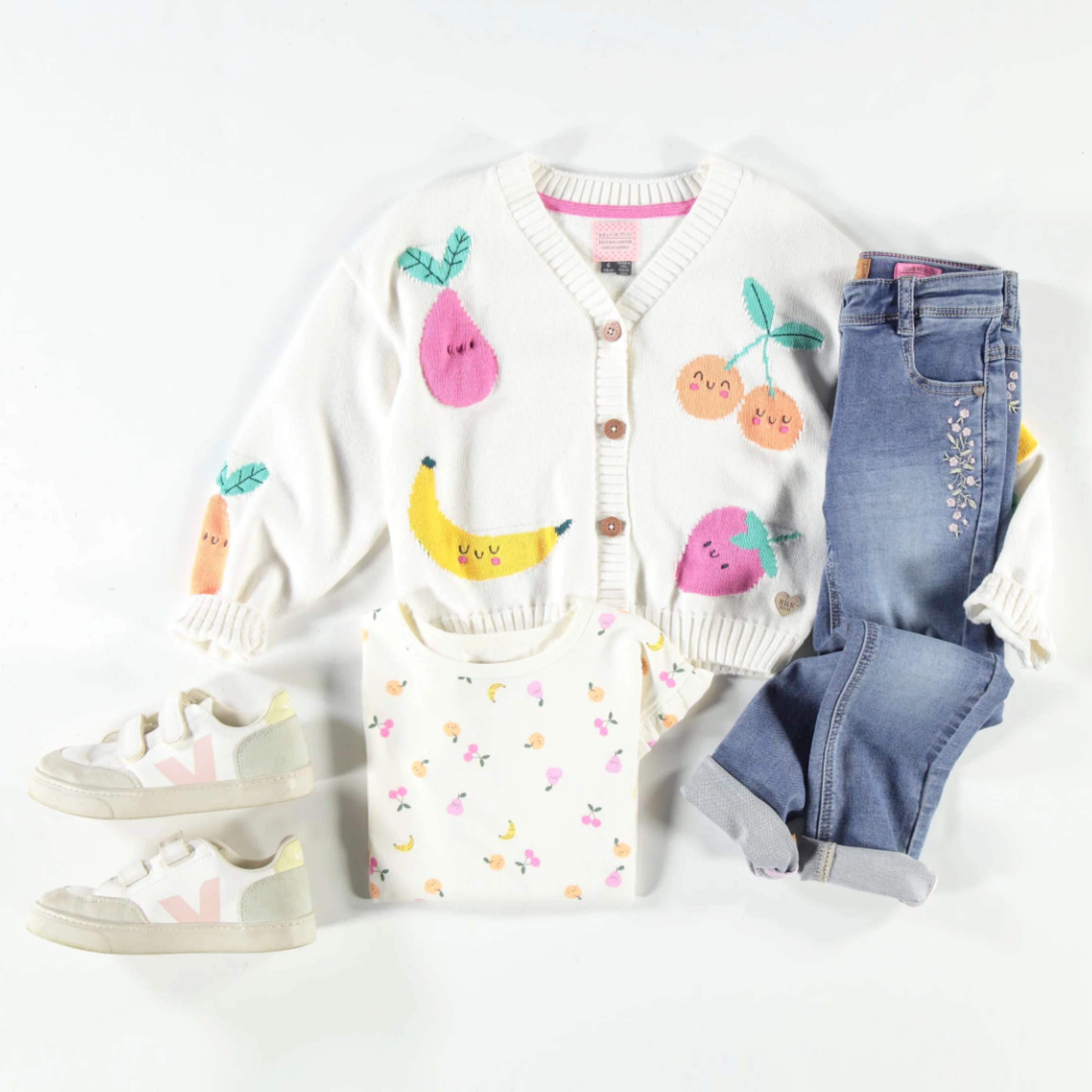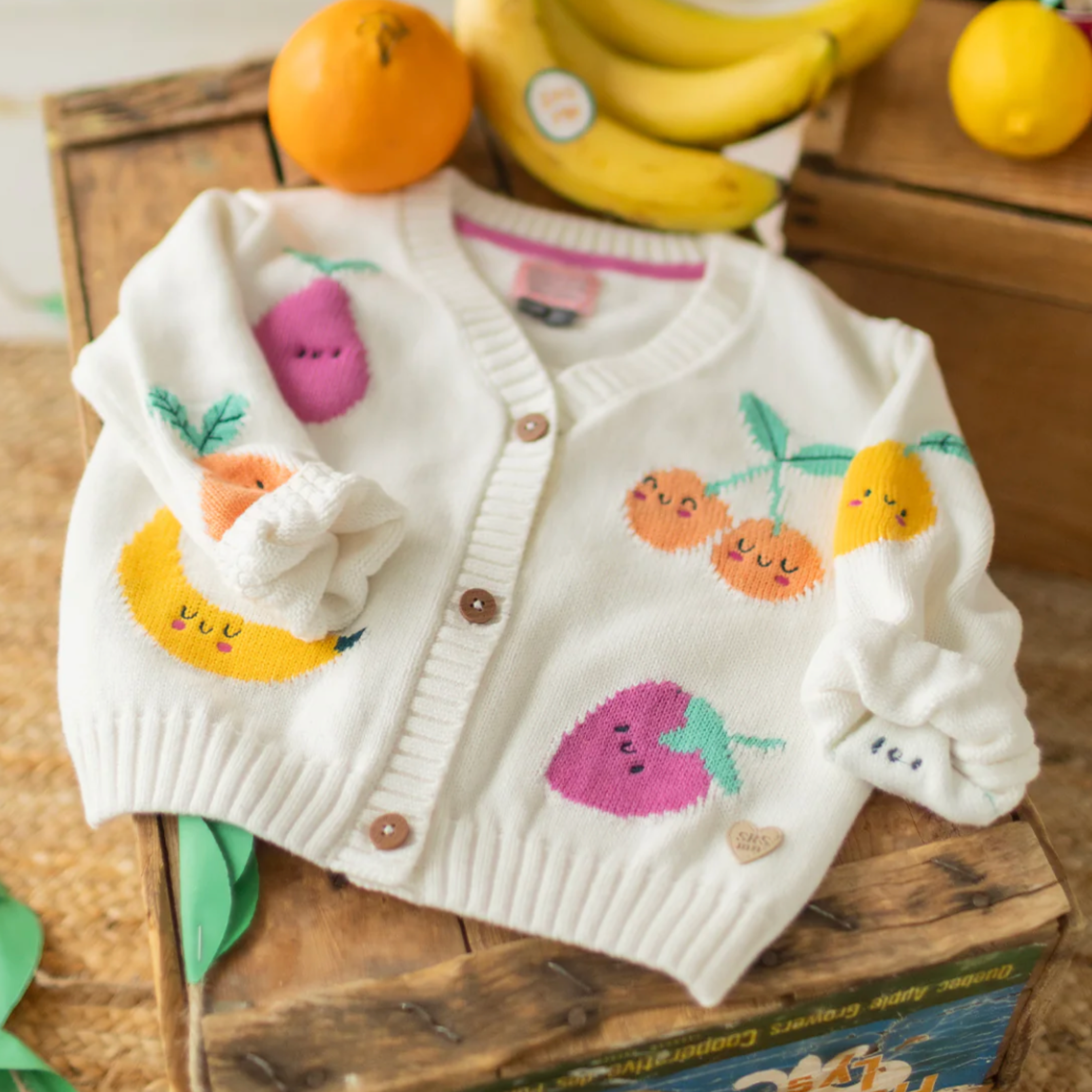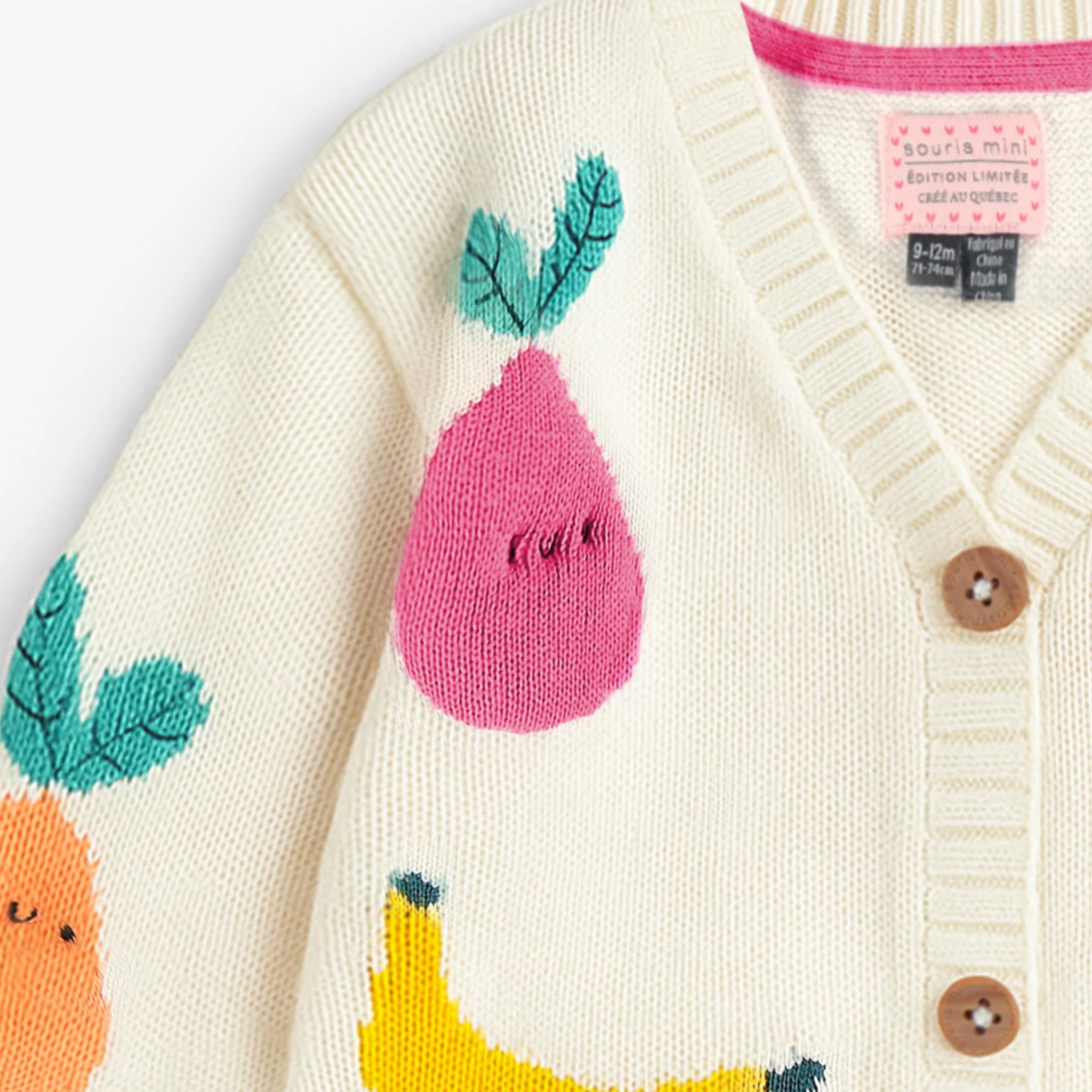 Cream knit cardigan with colorful jacquard fruit patterns. Features a V-neck and three buttons for easy dressing. The hem, collar, and cuffs are finished with ribbed knit for added detail and a better fit. Made of 100% cotton knit in a regular fit for maximum comfort.