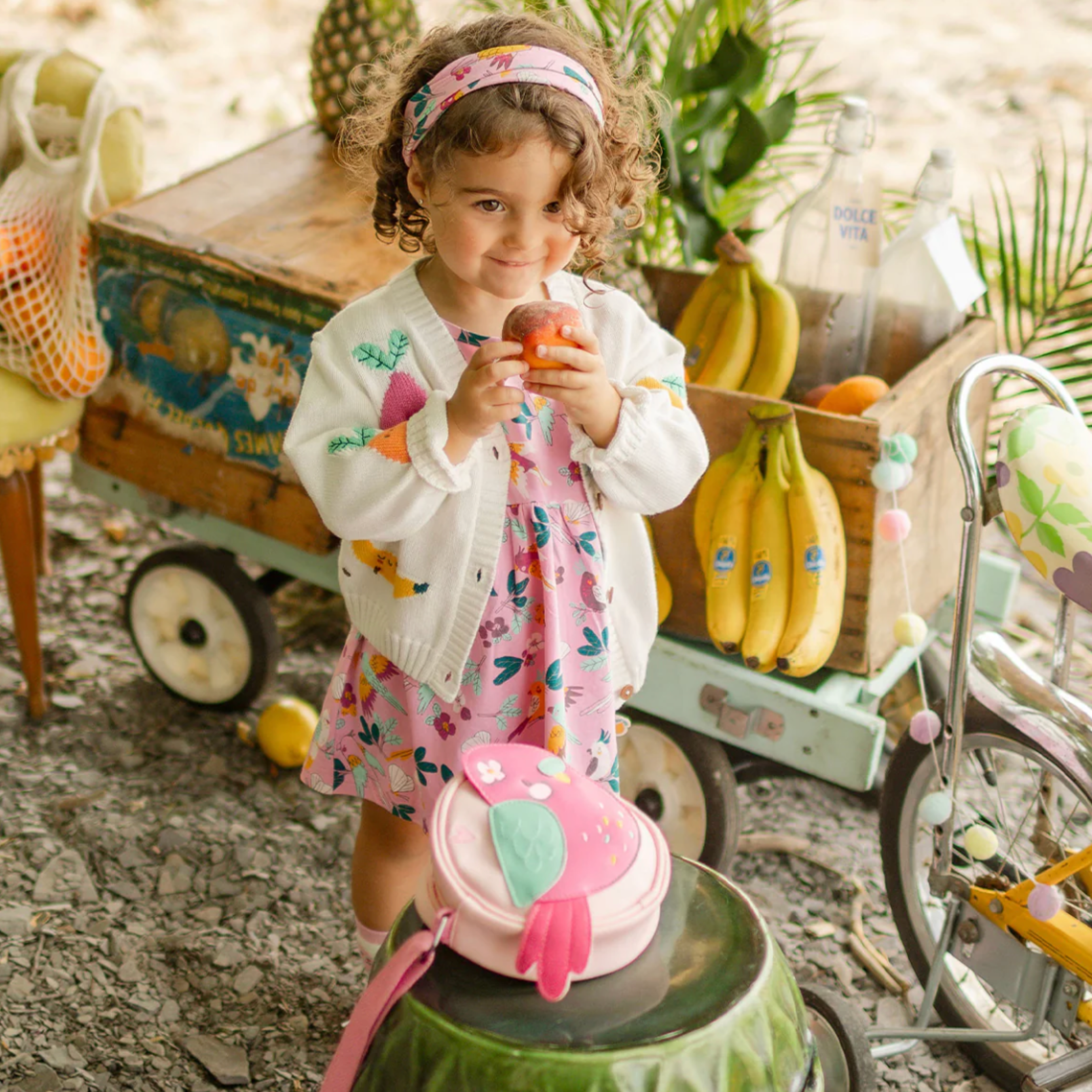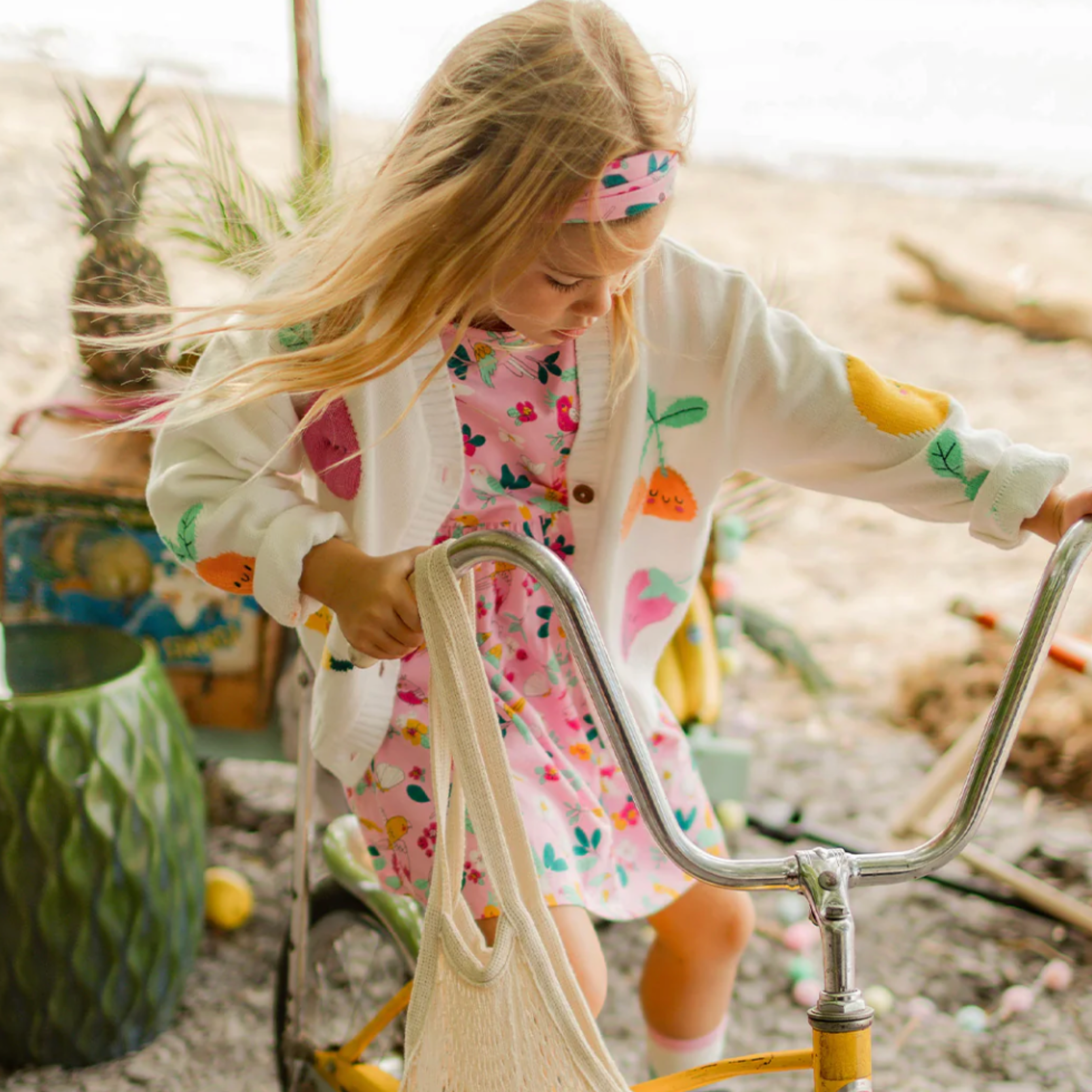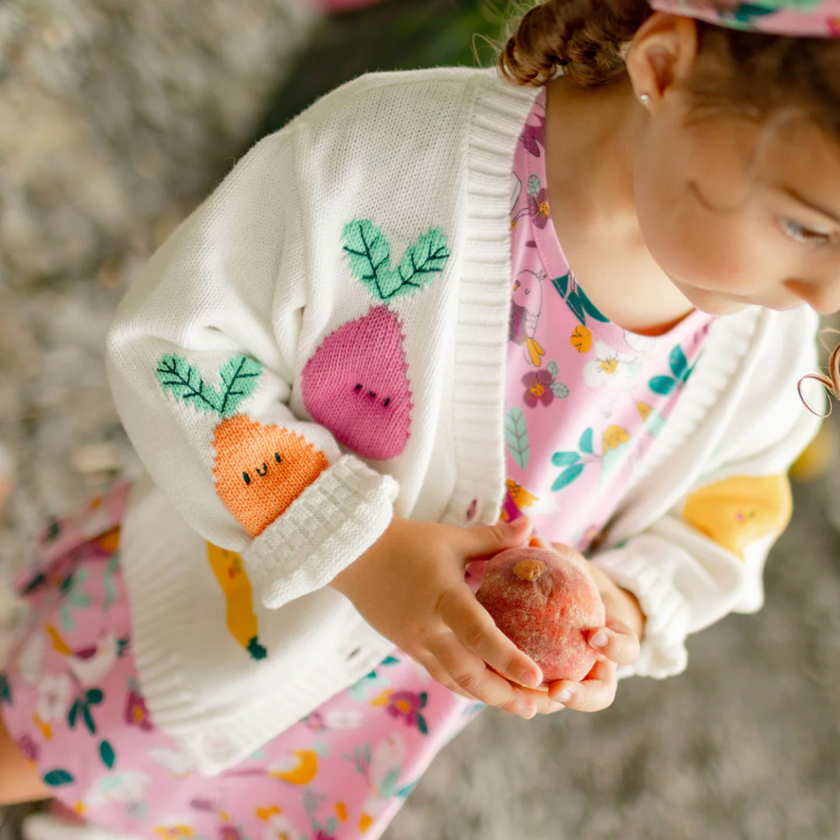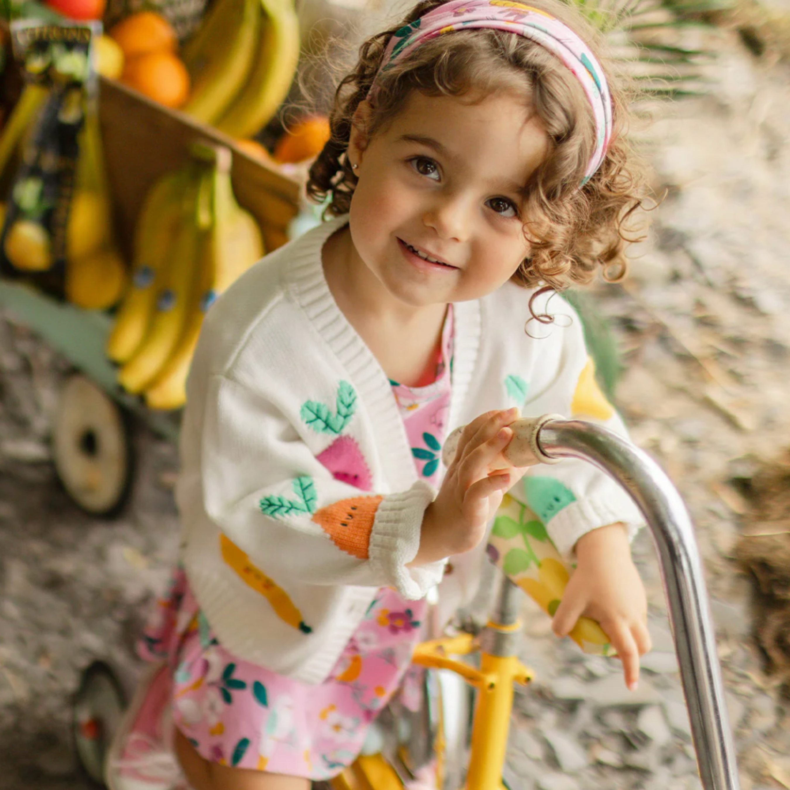 Cream knit cardigan with colorful jacquard fruit patterns. Features a V-neck and three buttons for easy dressing. The hem, collar, and cuffs are finished with ribbed knit for added detail and a better fit. Made of 100% cotton knit in a regular fit for maximum comfort.