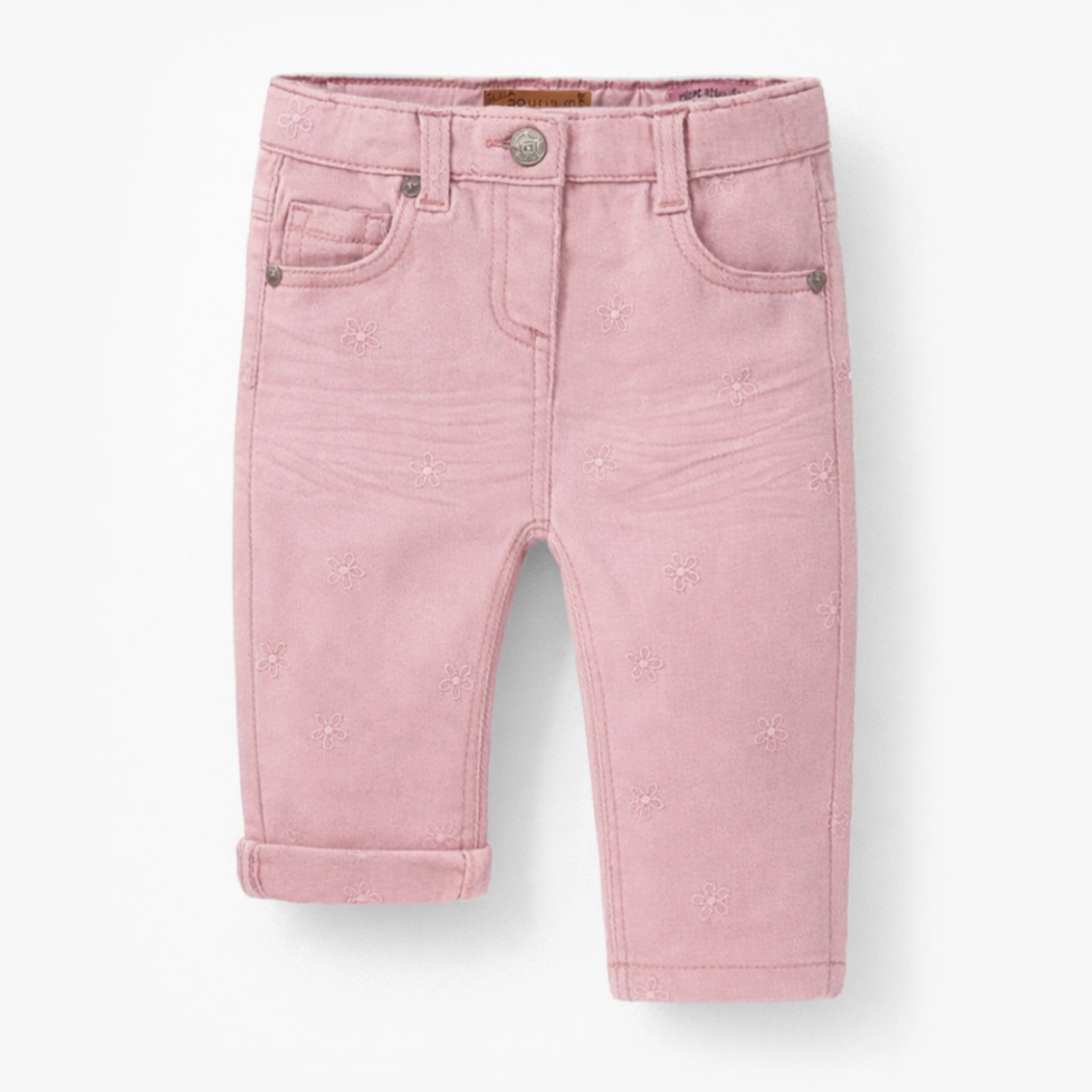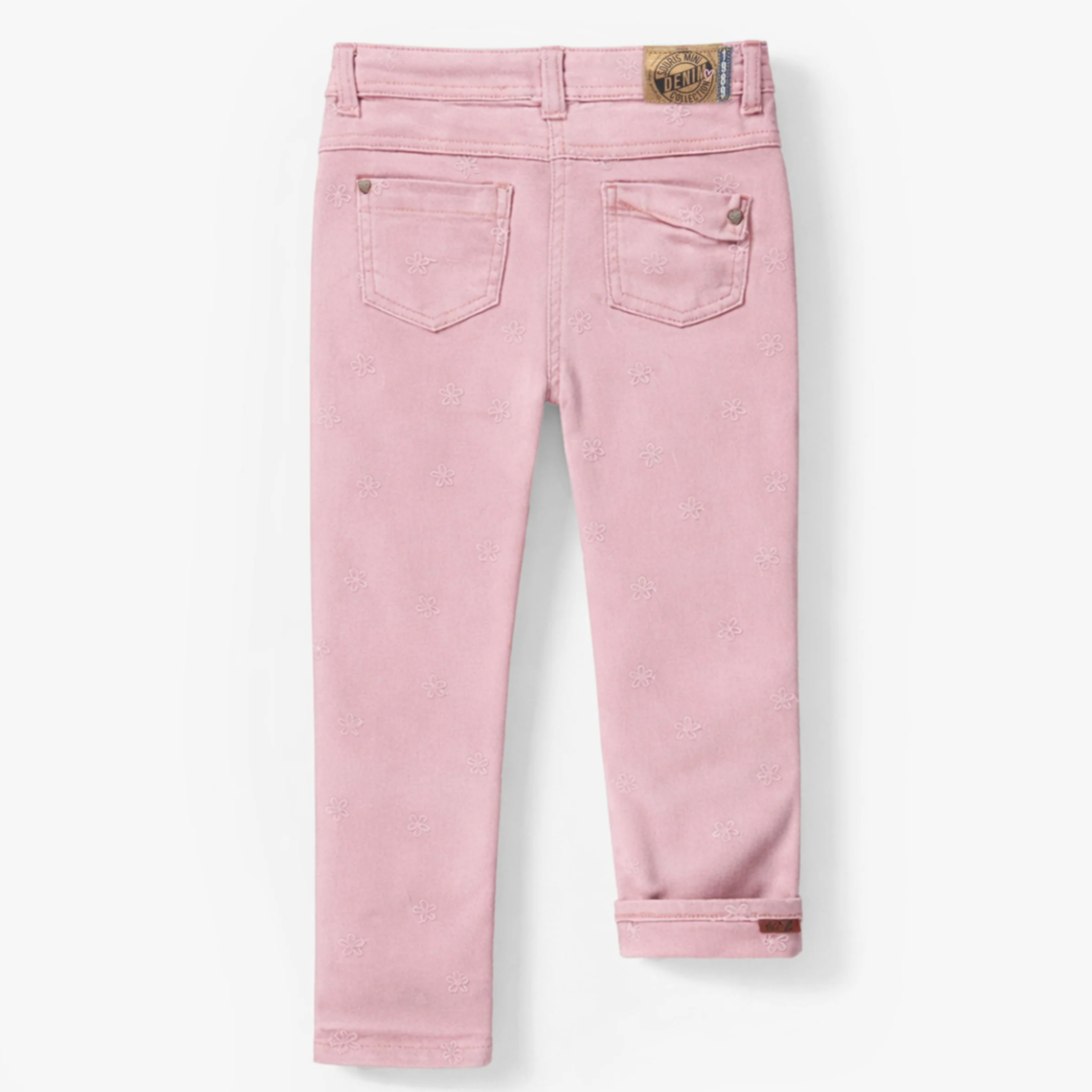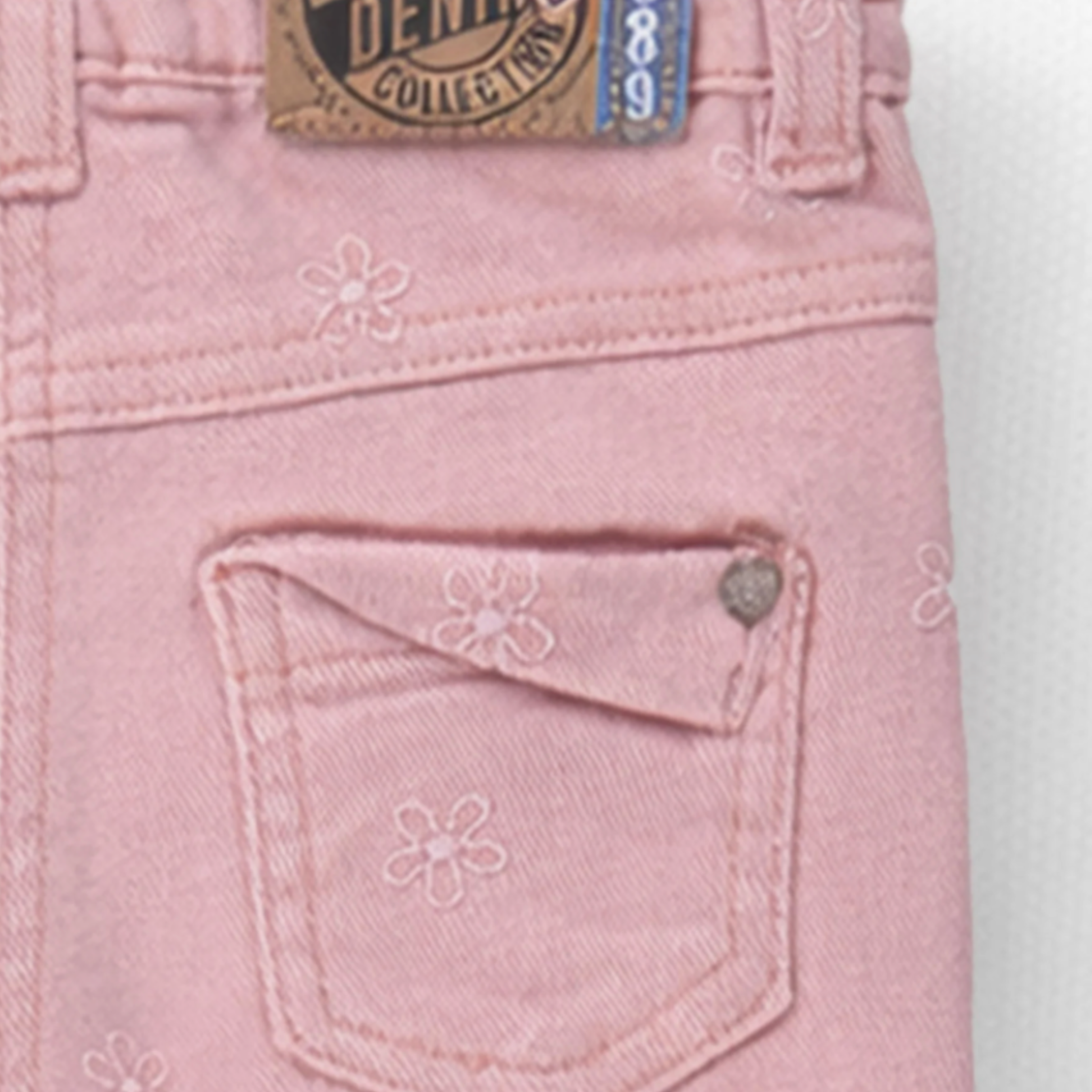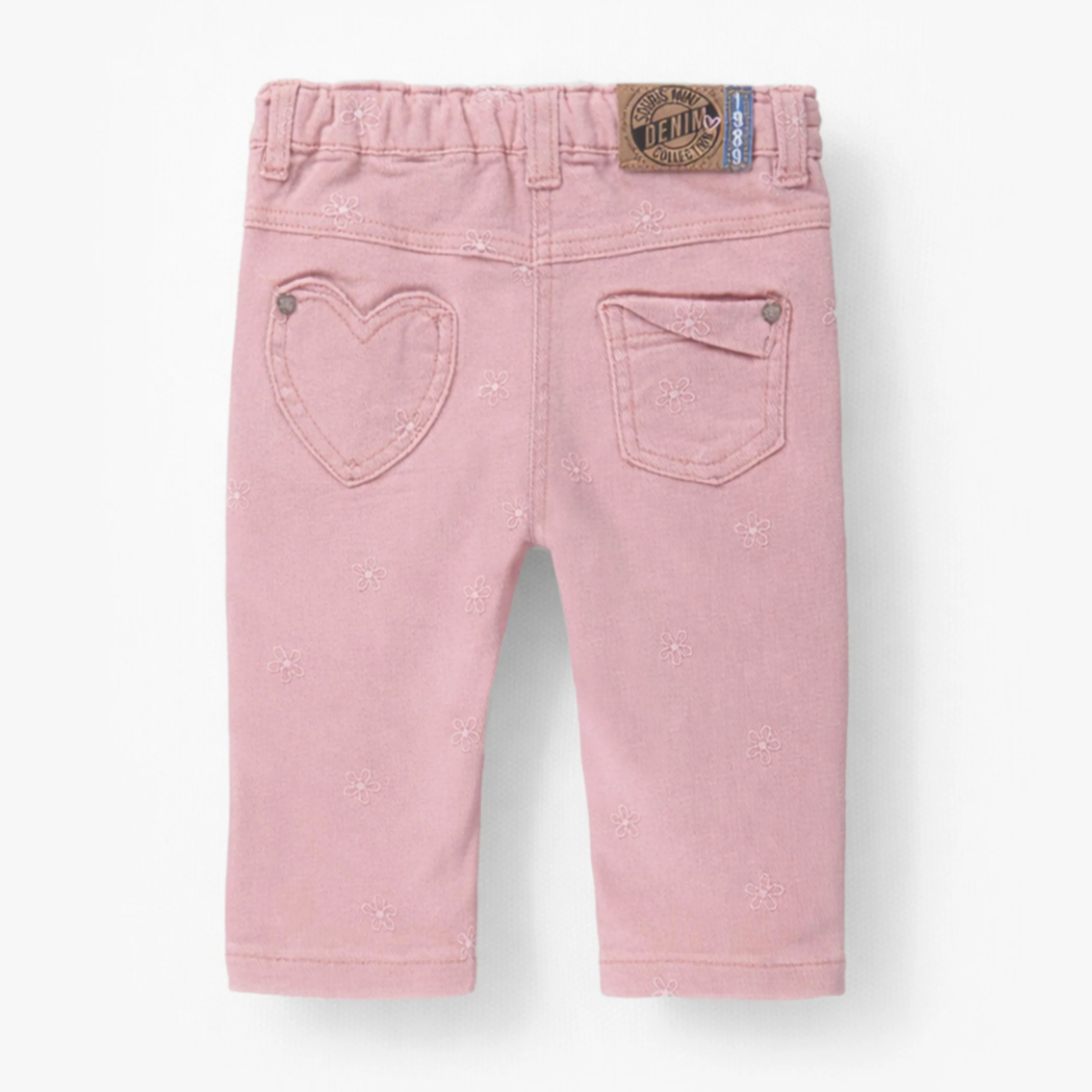 Pink jeans with floral embroidery for an adorable look. Features an elastic waistband and a snap button. Includes two front pockets. The mismatched back pockets add a unique touch to this piece. Made from lightweight, comfortable denim in a regular fit.