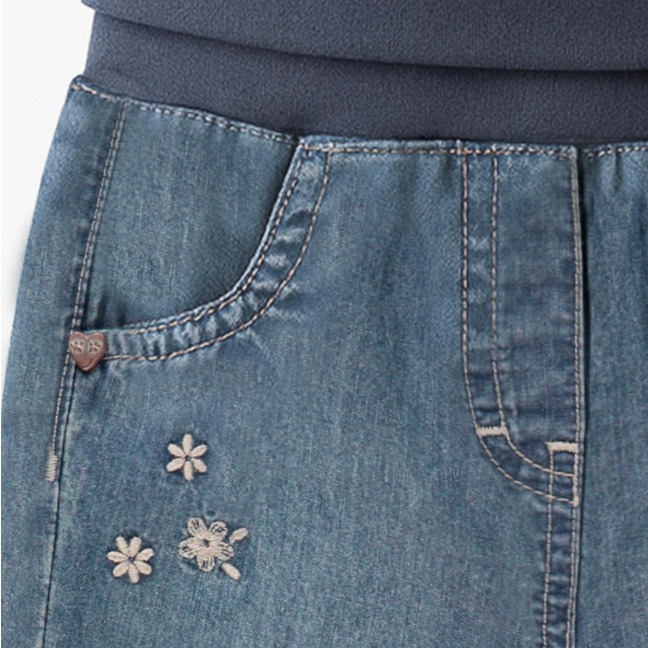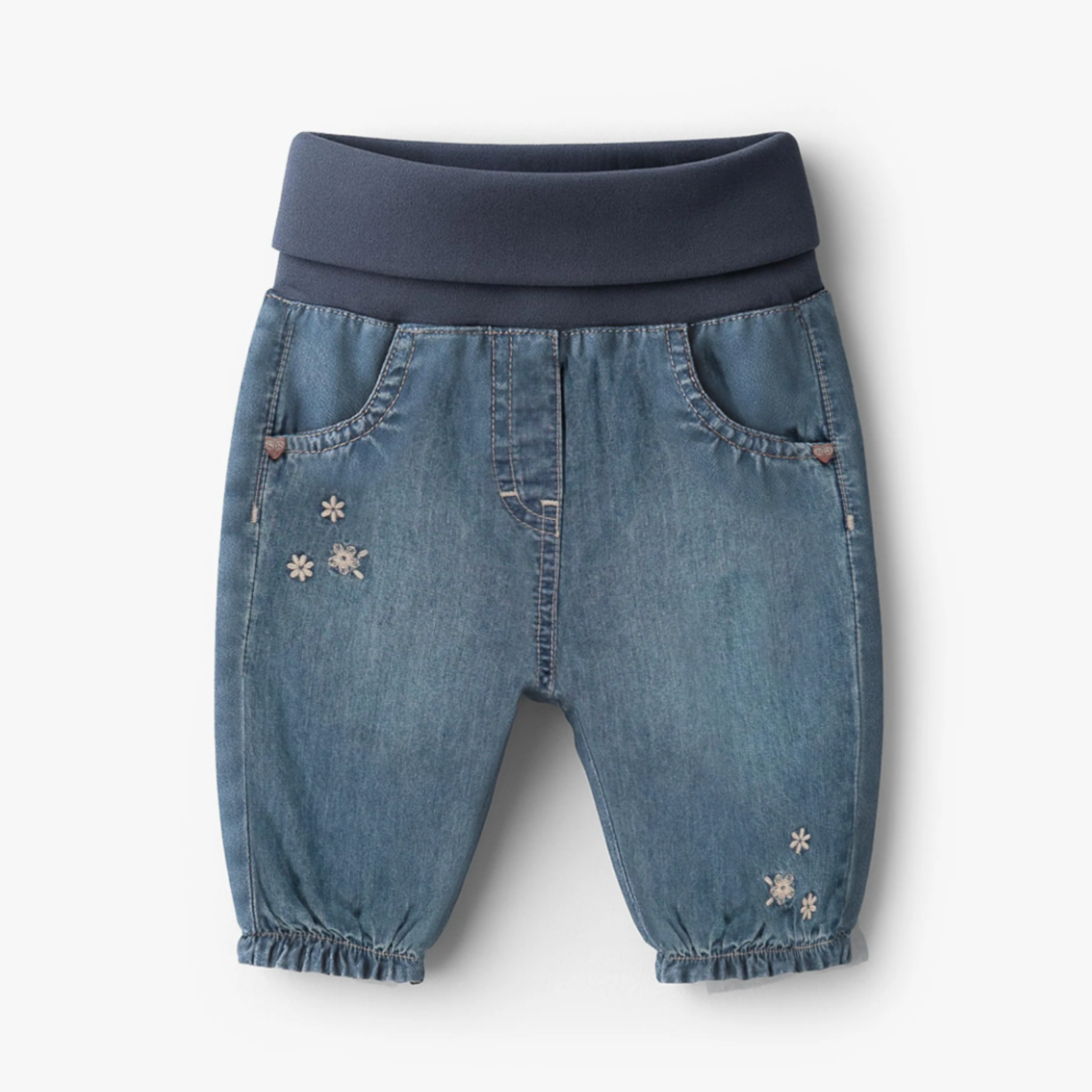 Evolutive pants with embroidery for a feminine and adorable look. Features a wide foldable waistband that adjusts as baby grows. The ankles are elasticized for a better fit. Made of lightweight, comfortable denim in a regular fit.