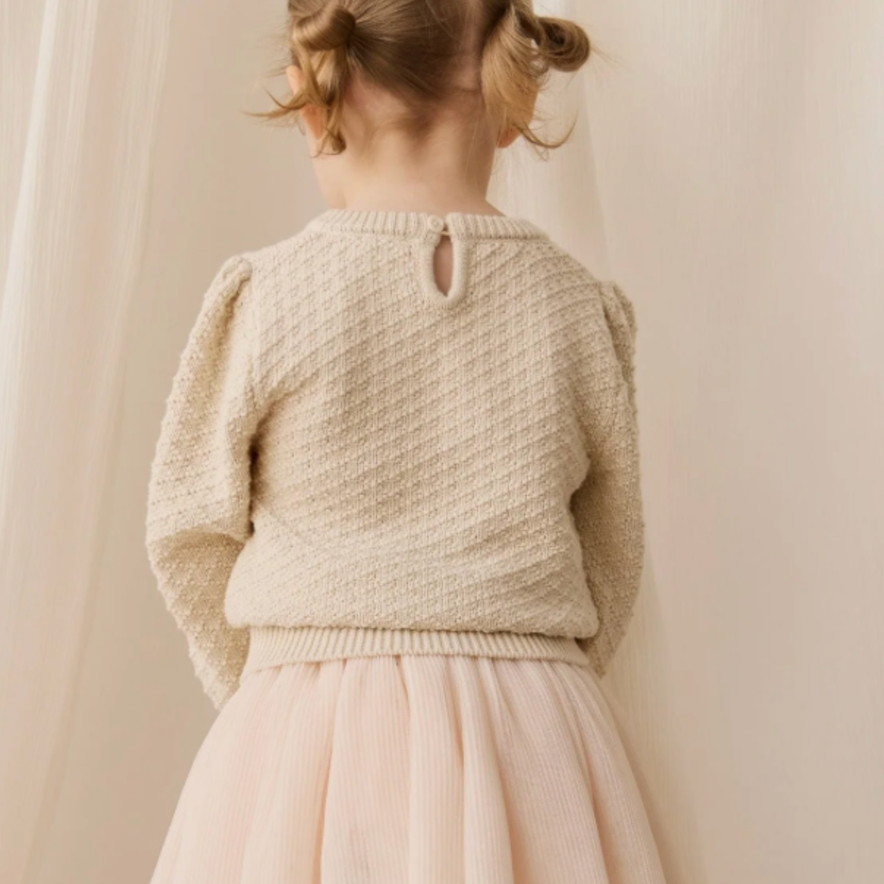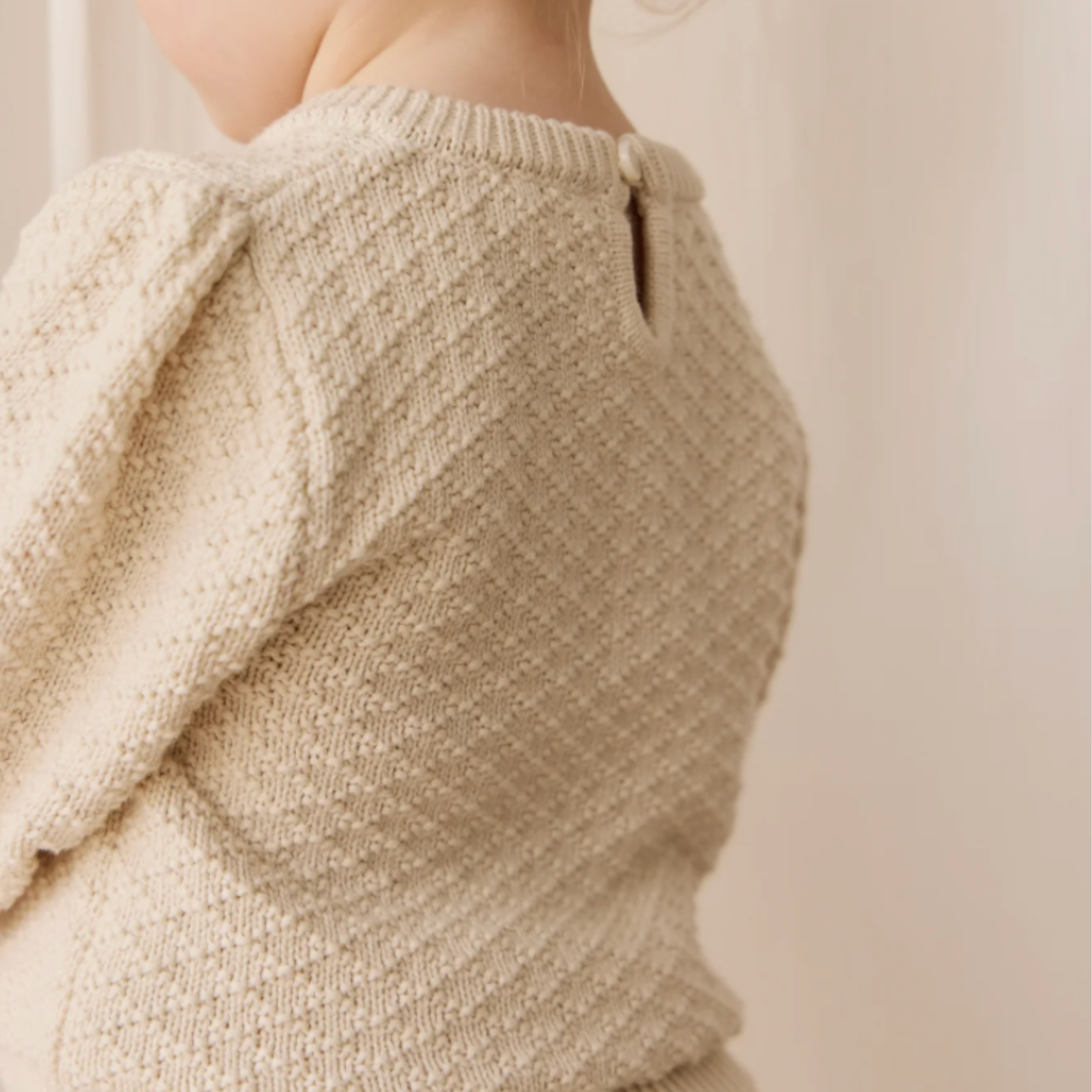 A timeless knit for cooler days, the Harlow Jumper – Vanilla features a soft cream hue, textured knit pattern, and classic round neckline. With ribbed cuffs and hem, plus a sweet button closure at the back, this jumper is both practical and beautifully detailed.