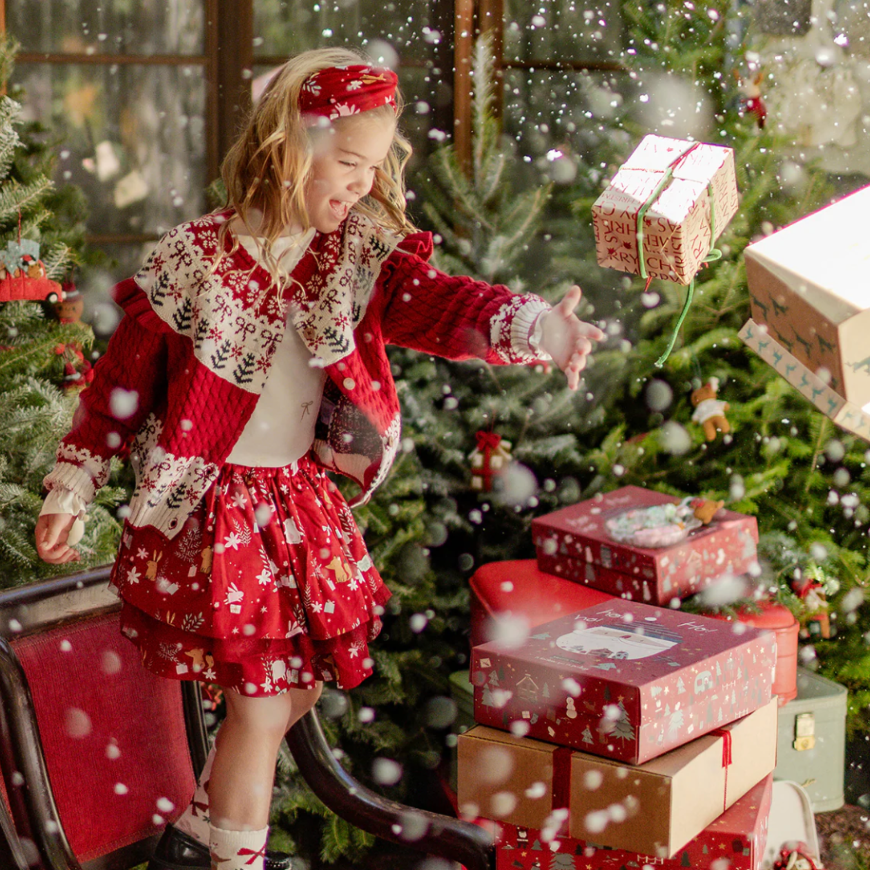 This charming red knit cardigan features festive jacquard designs and a frill detail for a feminine touch. It includes a round neckline, ribbed cuffs, and hem for a snug fit, along with faux wood buttons for easy dressing and added style.