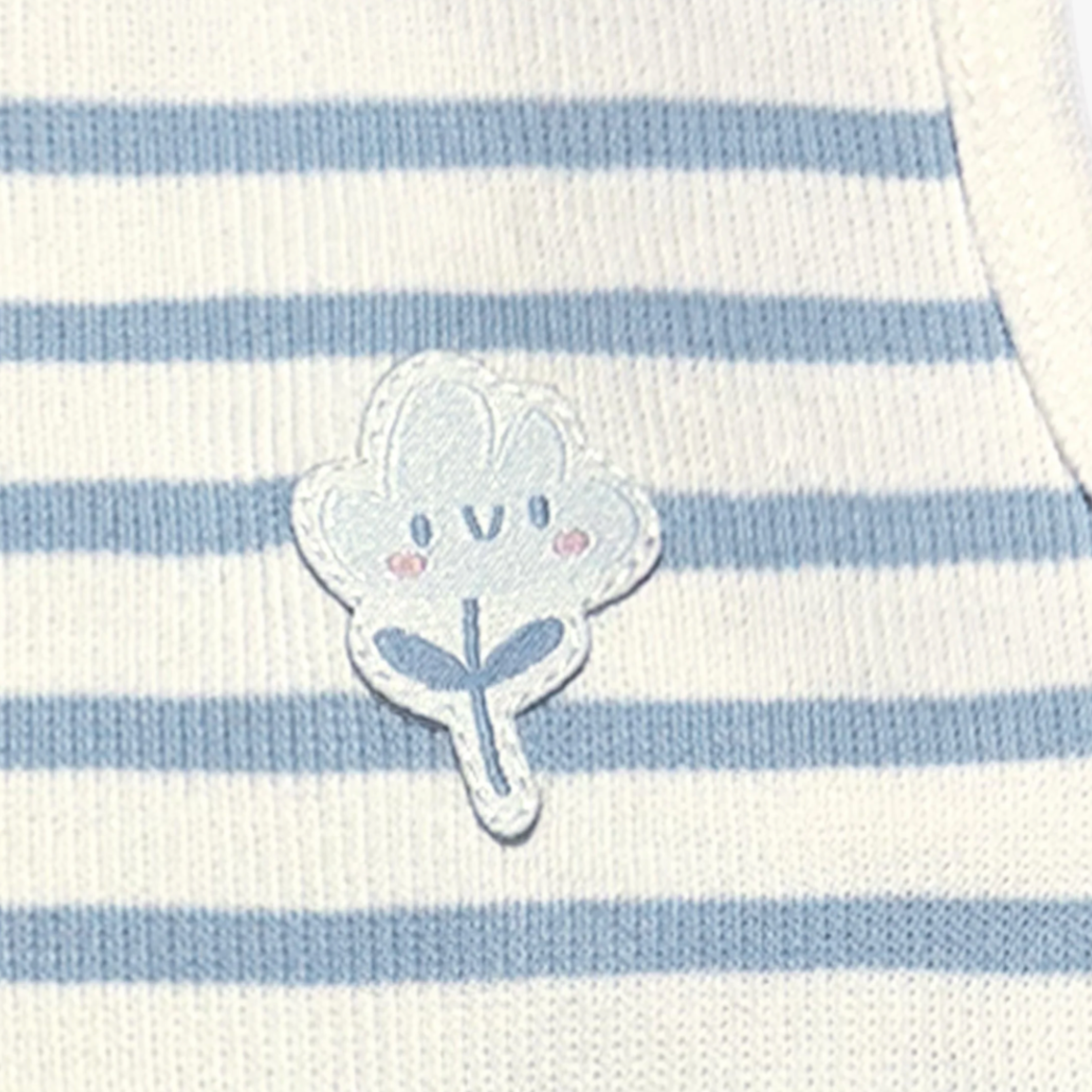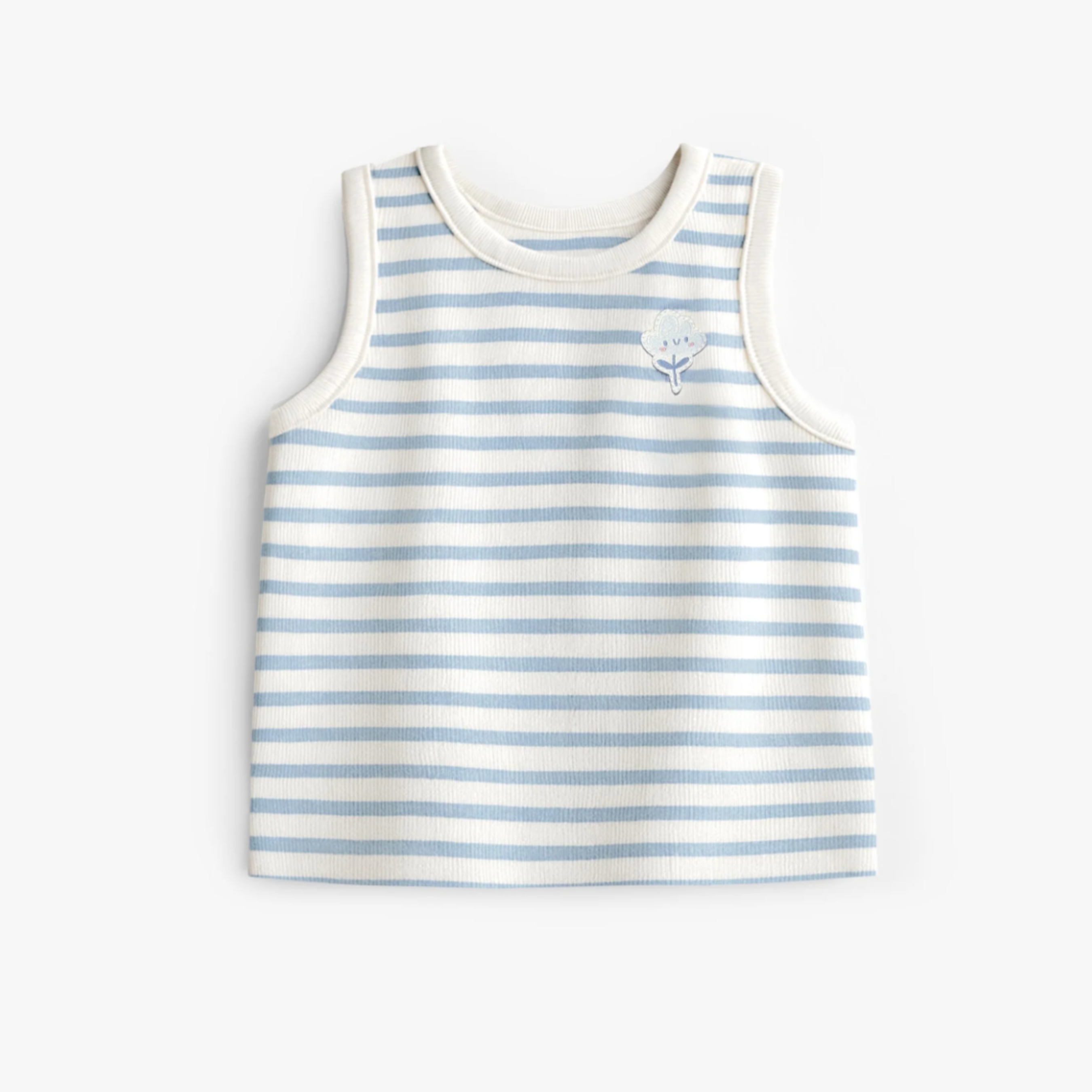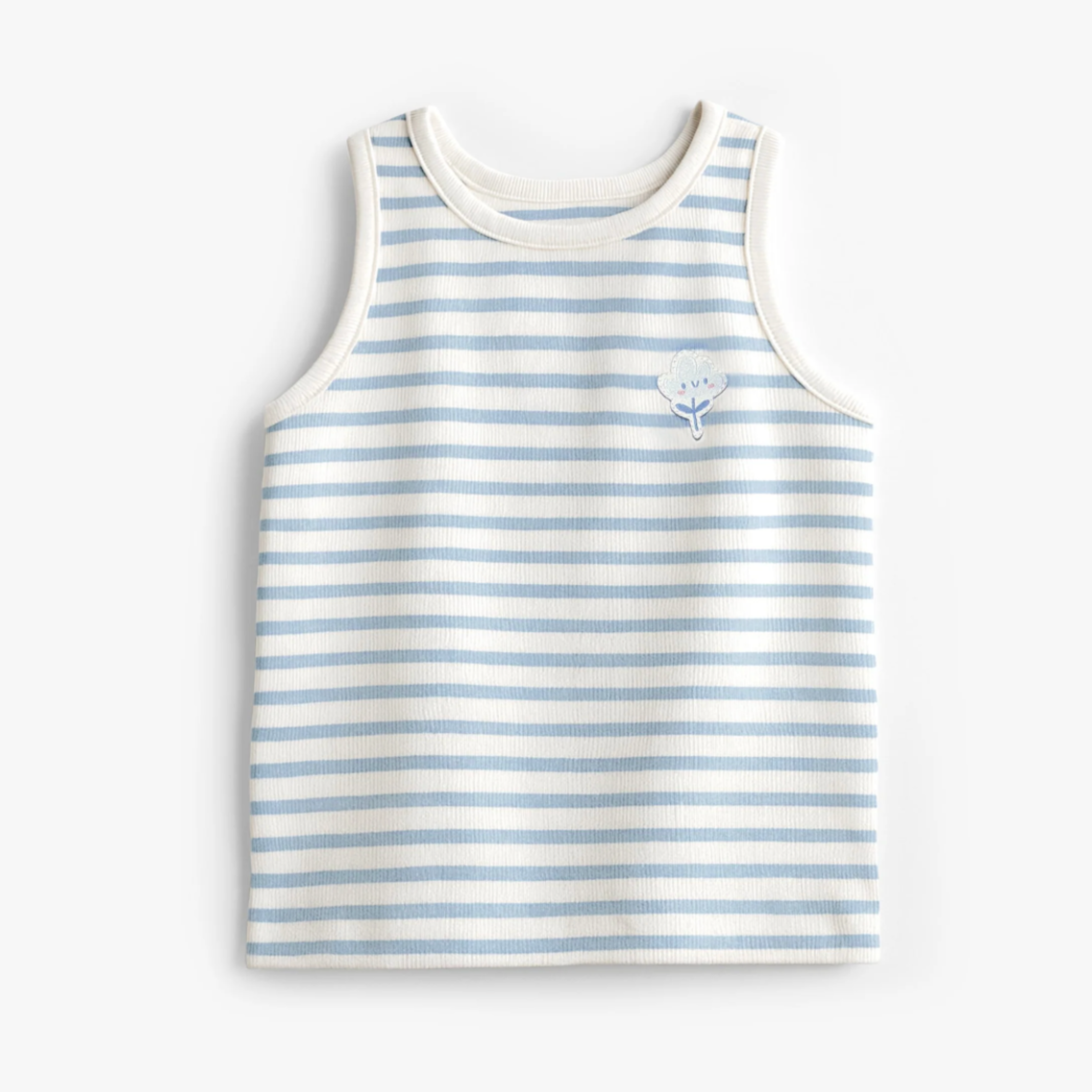 White tank top with blue stripes and a cute flower patch. Features wide straps and a round neckline. Made from comfortable ribbed knit, it pairs well with everything.