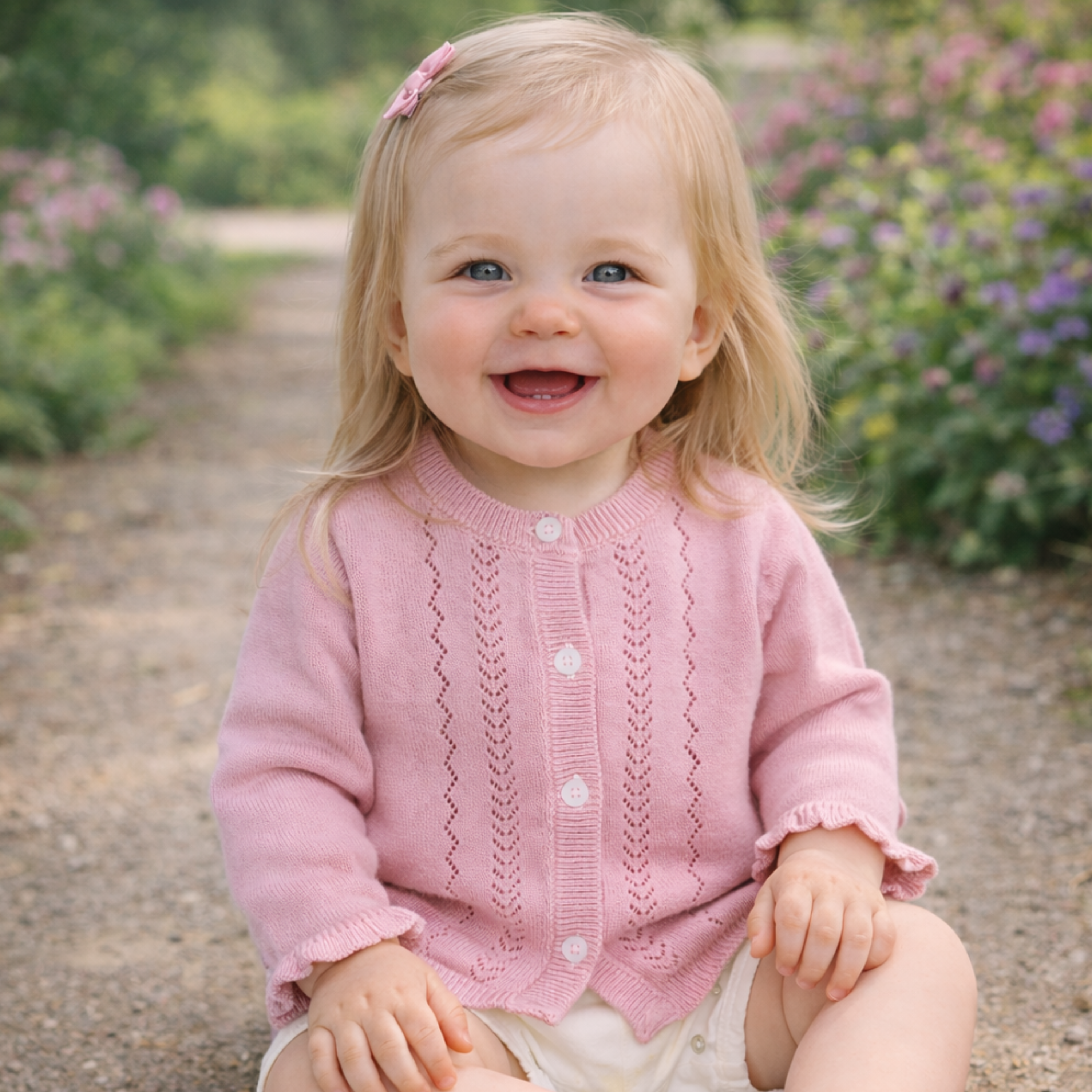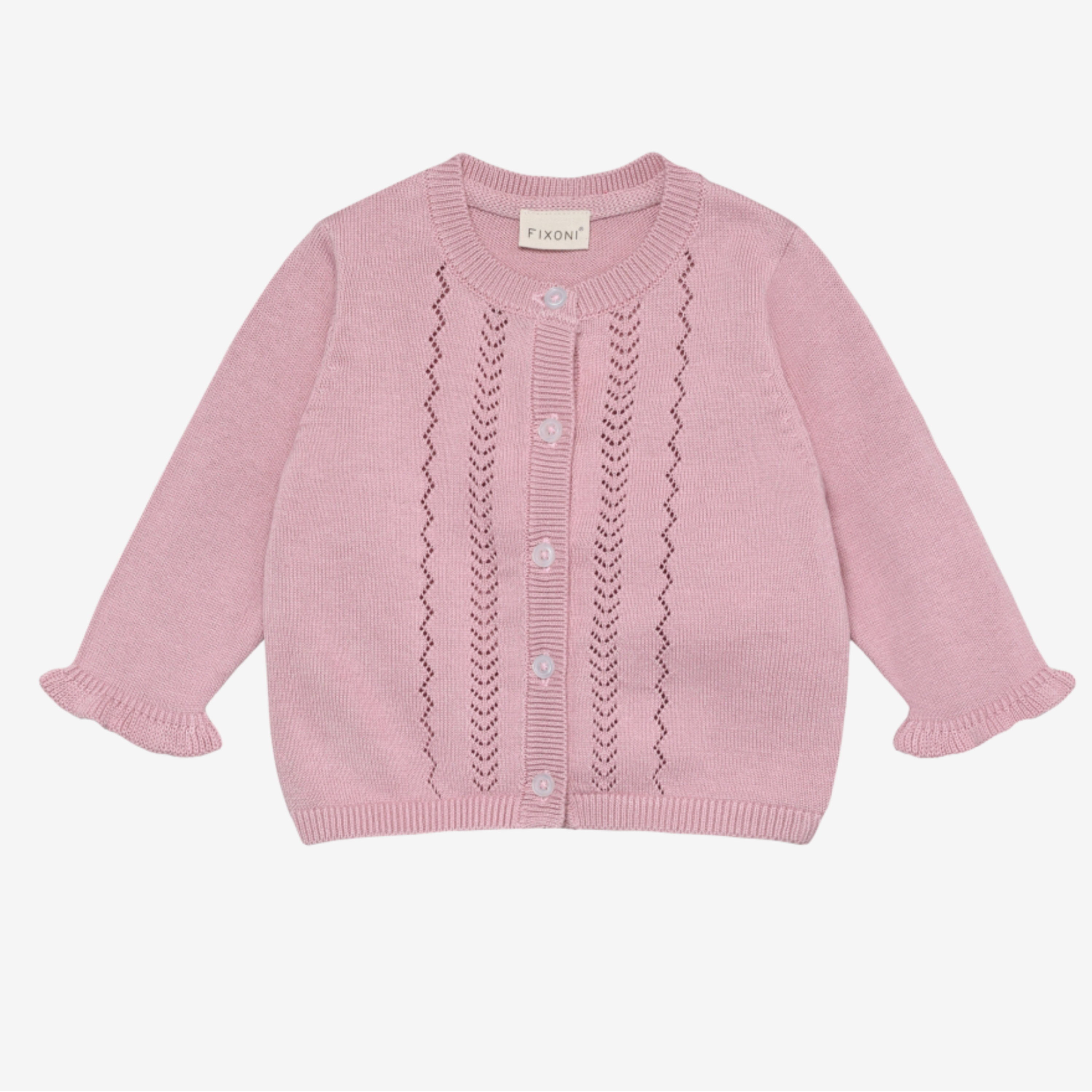 Wrap your little one in softness with this dreamy bleached mauve cardigan from FIXONI. Crafted from 100% organic cotton knit and certified by GOTS, it's as gentle on delicate skin as it is lovely to look at. The front button closure and beautiful knit texture make it perfect for layering through spring and beyond. Available in newborn through 24 months, this timeless piece is an absolute must-have for any baby girl's wardrobe.