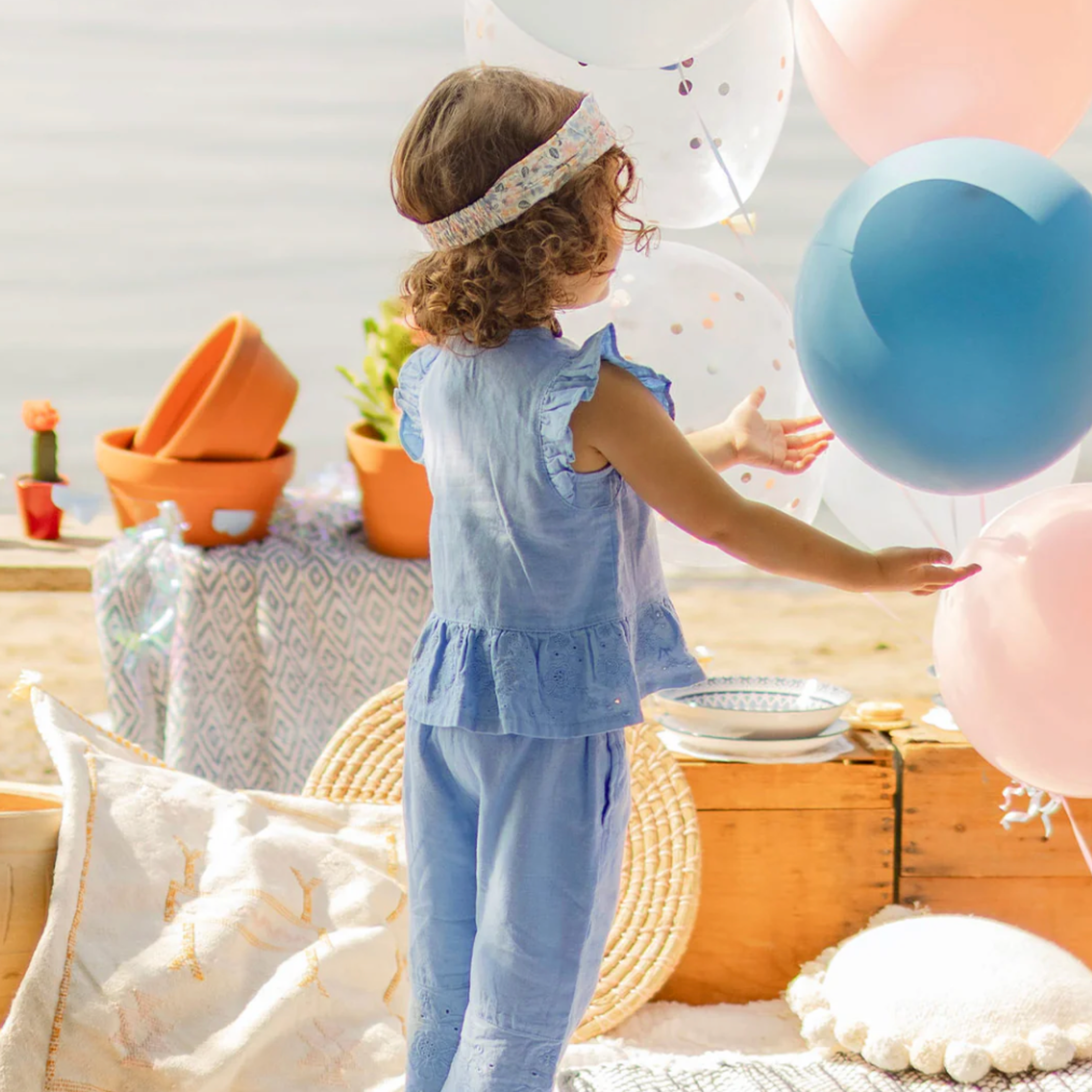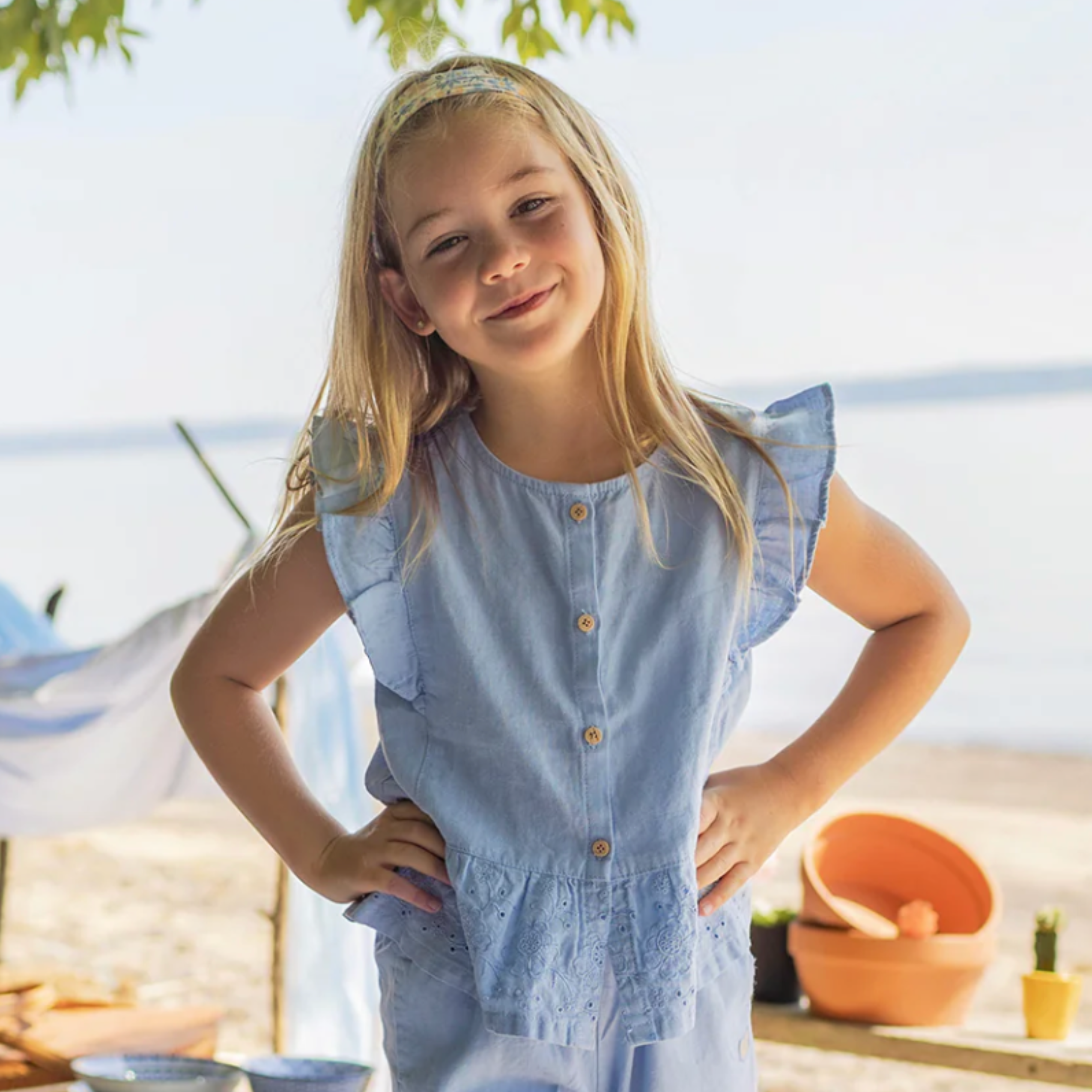 Blue blouse with broderie anglaise and ruffles at the arm openings for a fully feminine look. Features a round neckline and buttons. Made from a cotton and linen blend for maximum comfort.