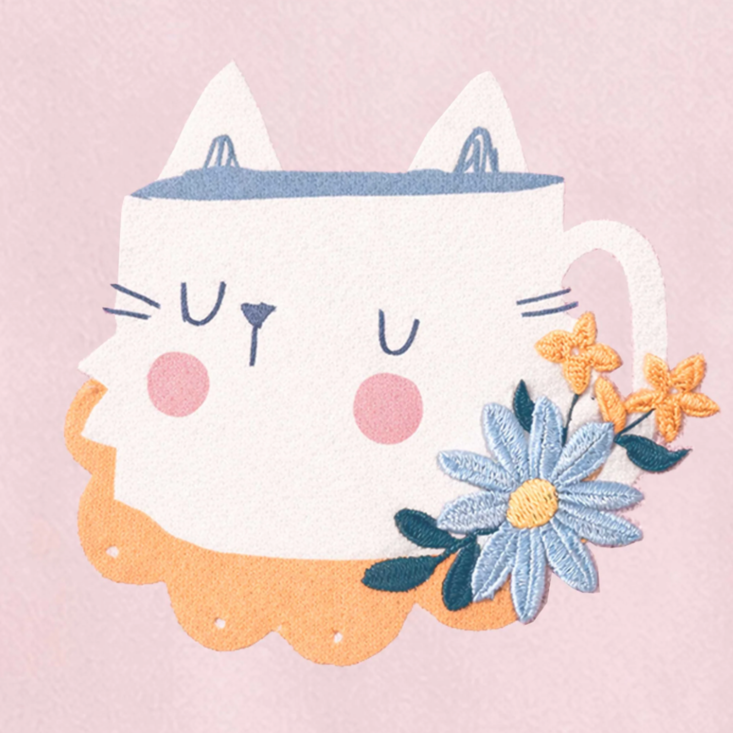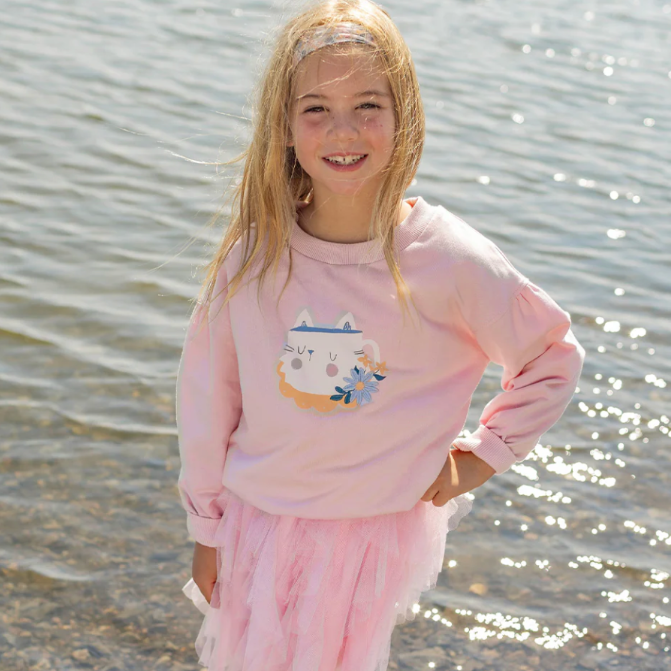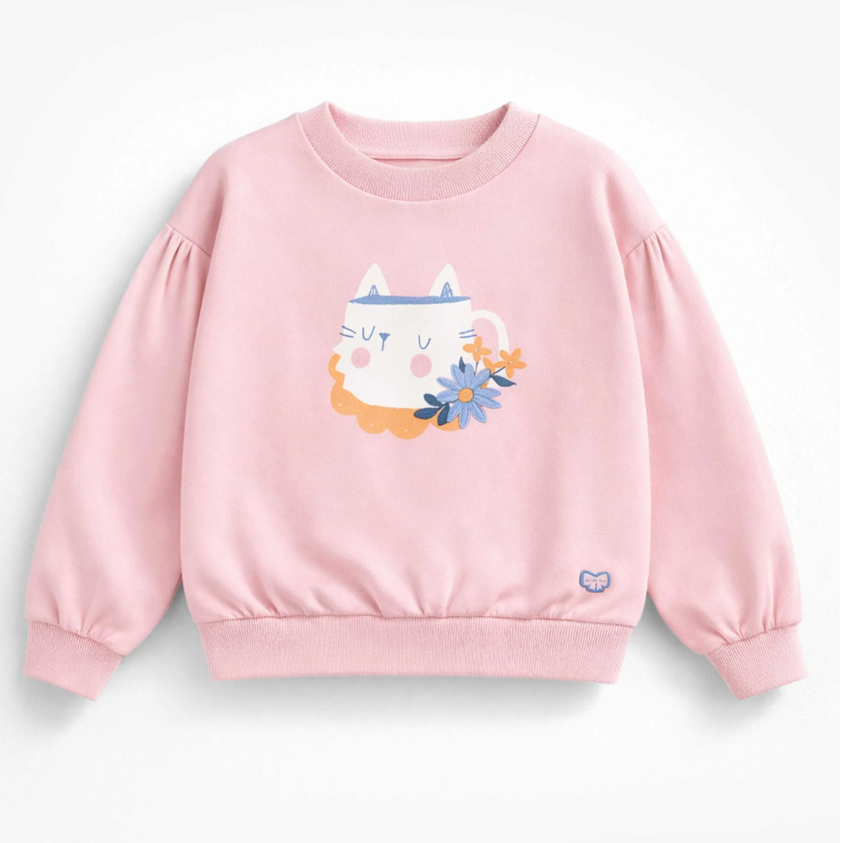 Pink sweatshirt with a cat-shaped mug with flowers illustration. Features long sleeves and a round neckline. The hem, collar, and cuffs are ribbed for a better fit. Made of French terry in a relaxed fit for maximum comfort.