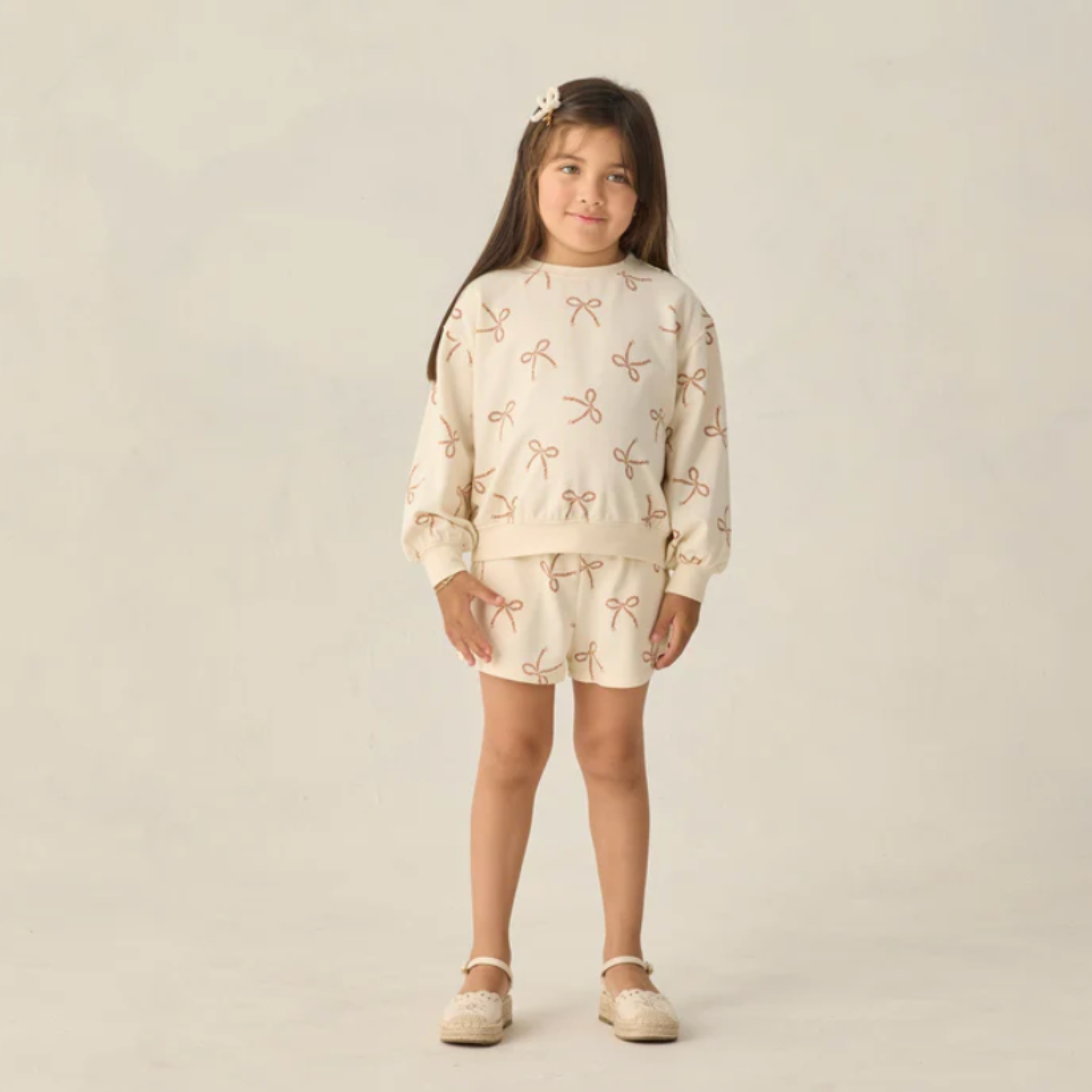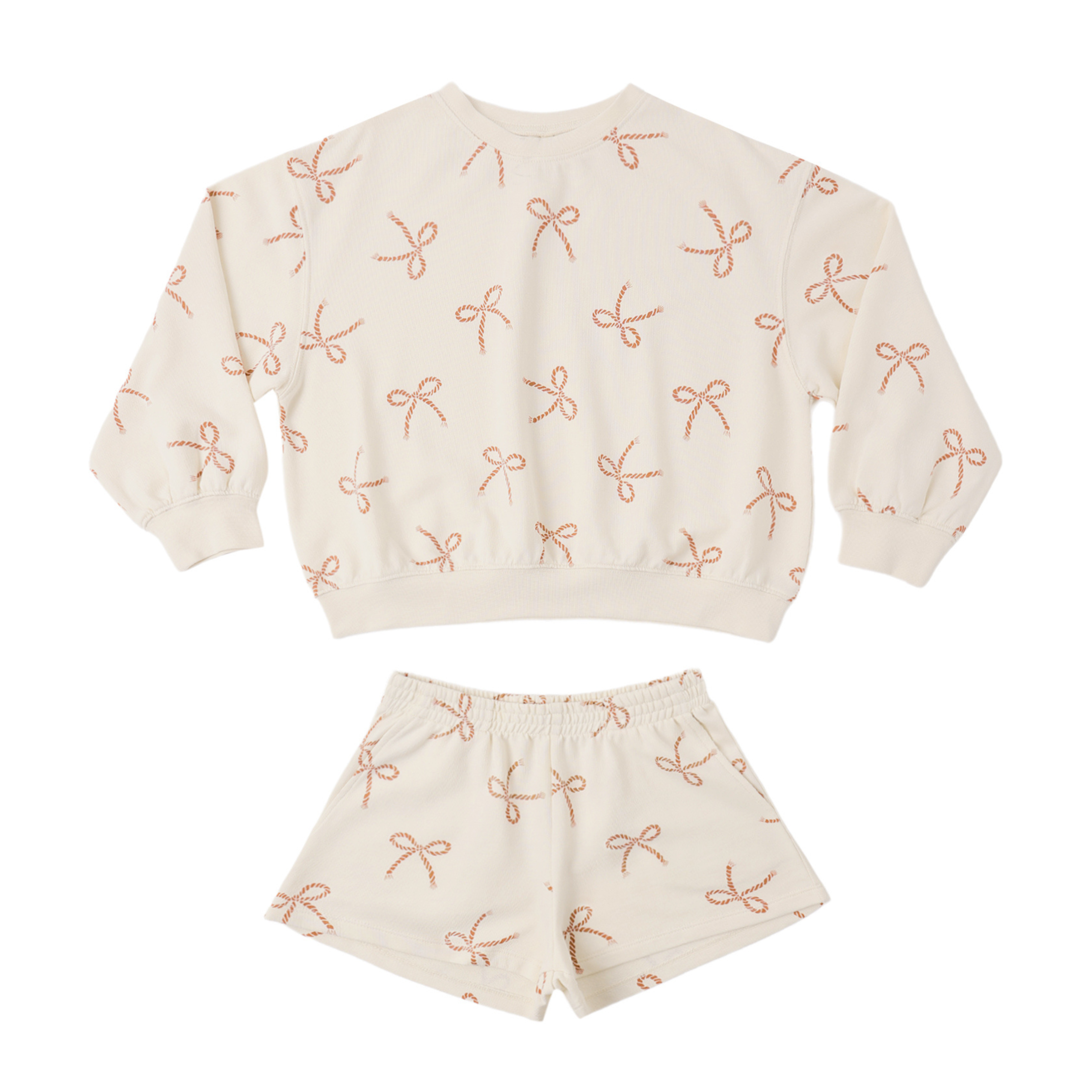 A relaxed sweatshirt and matching shorts with pockets and an elastic waistband come together in this cozy french terry summer set.