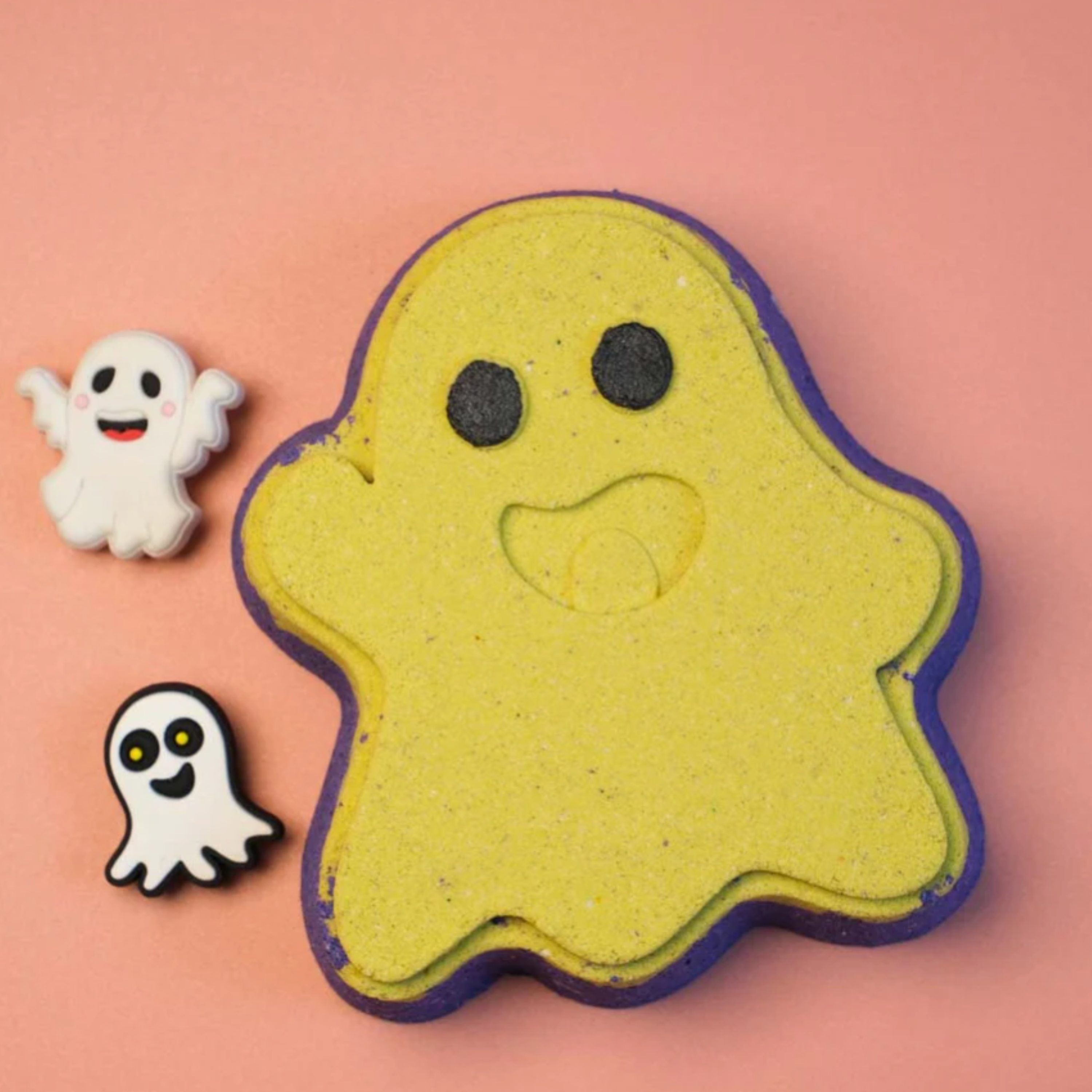 This spooky Halloween treat fizzes and swirls with eerie colors, releasing a hauntingly sweet scent. As it dissolves, a hidden surprise emerges from the bubbling foam, perfect for adding a touch of fun fright to your bath. A small ghost-shaped shoe charm designed to fit perfectly into the holes of popular shoes like Crocs or Natives.  Dare to drop it in and see what creature lurks inside!