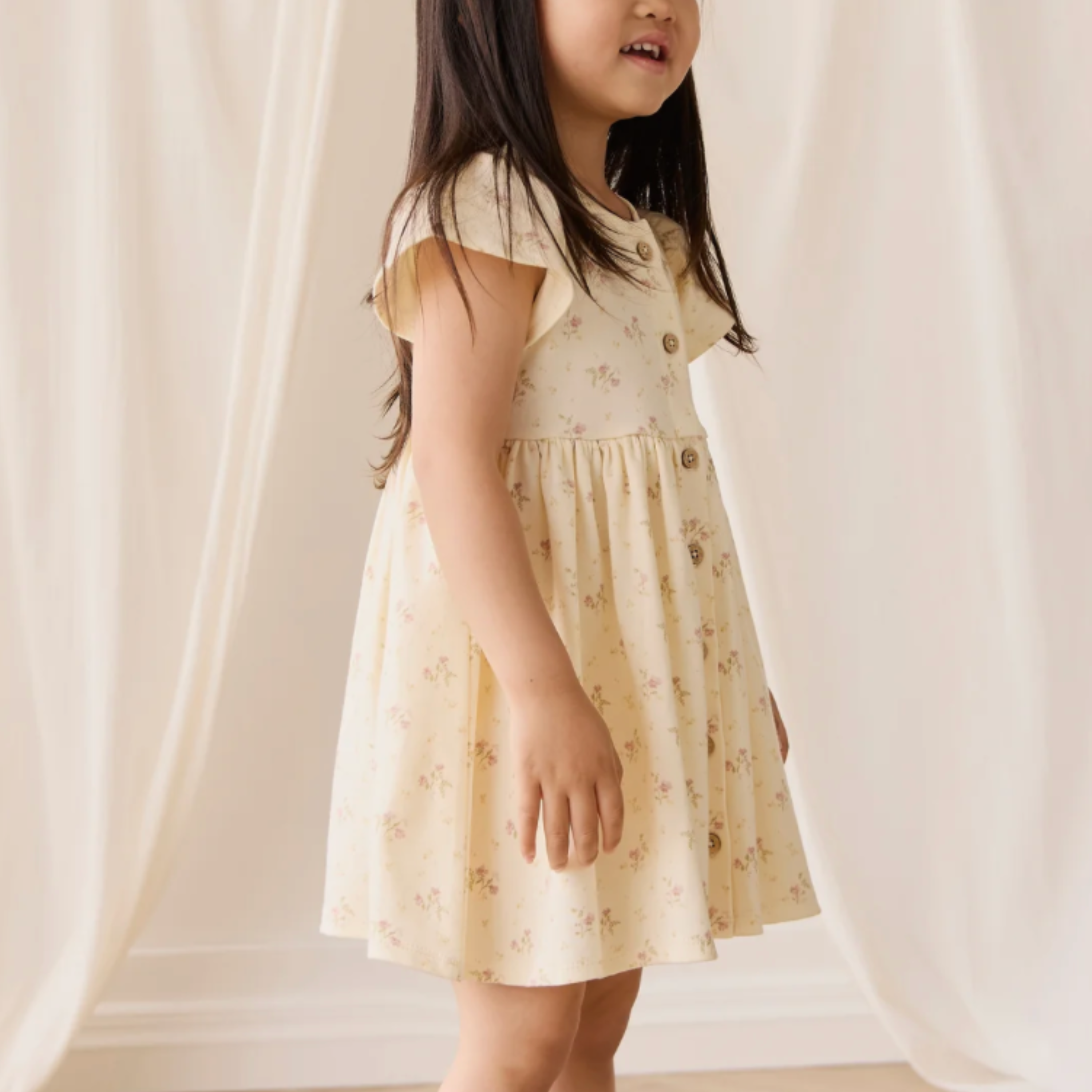 A beautifully vintage-inspired piece, the Organic Cotton Dahlia Dress – Thelma Parchment features a soft cream base adorned with a delicate floral print in blush and sage tones. With gently ruffled sleeves, a gathered skirt, and a row of coconut buttons down the bodice, this dress is perfect for both everyday charm and special occasions.