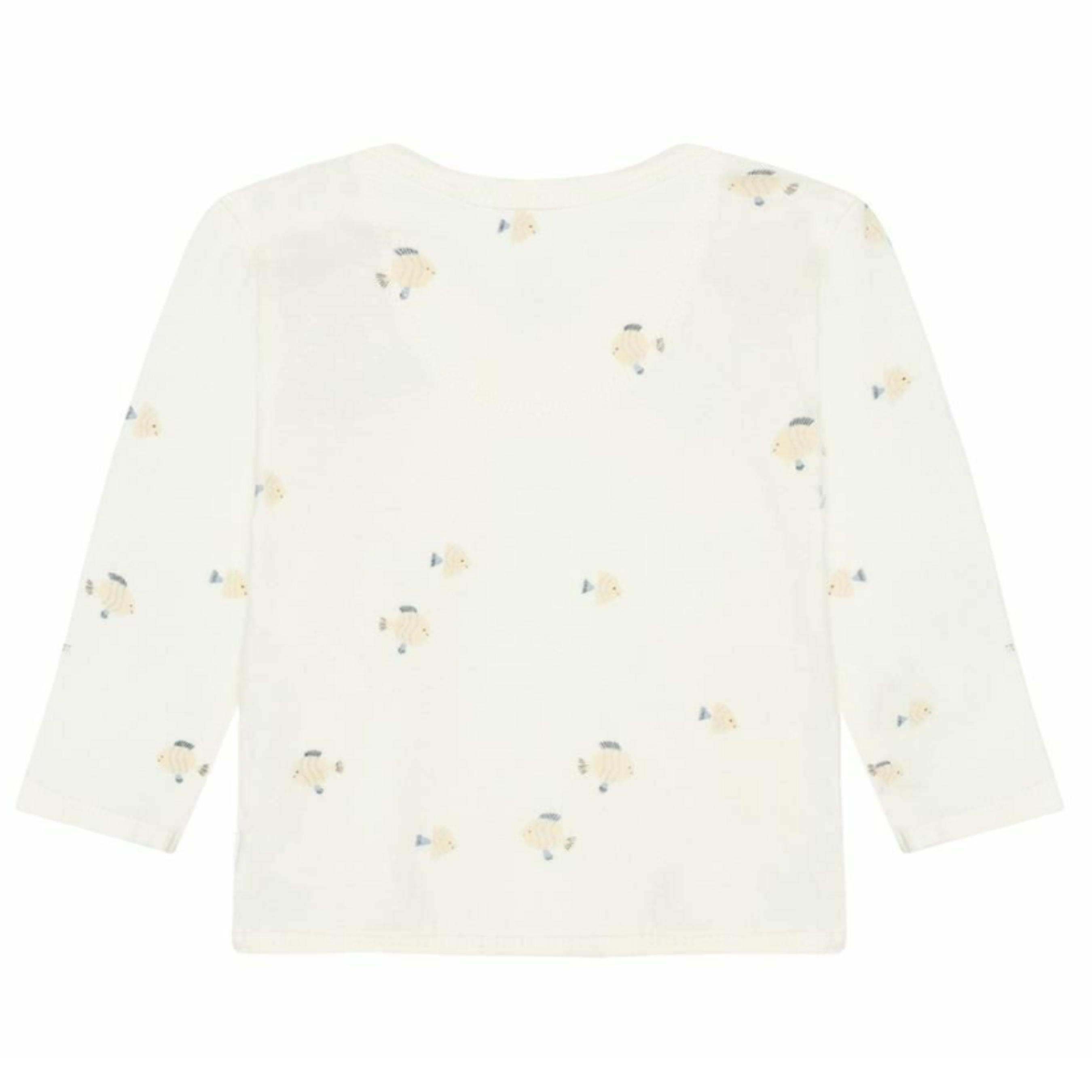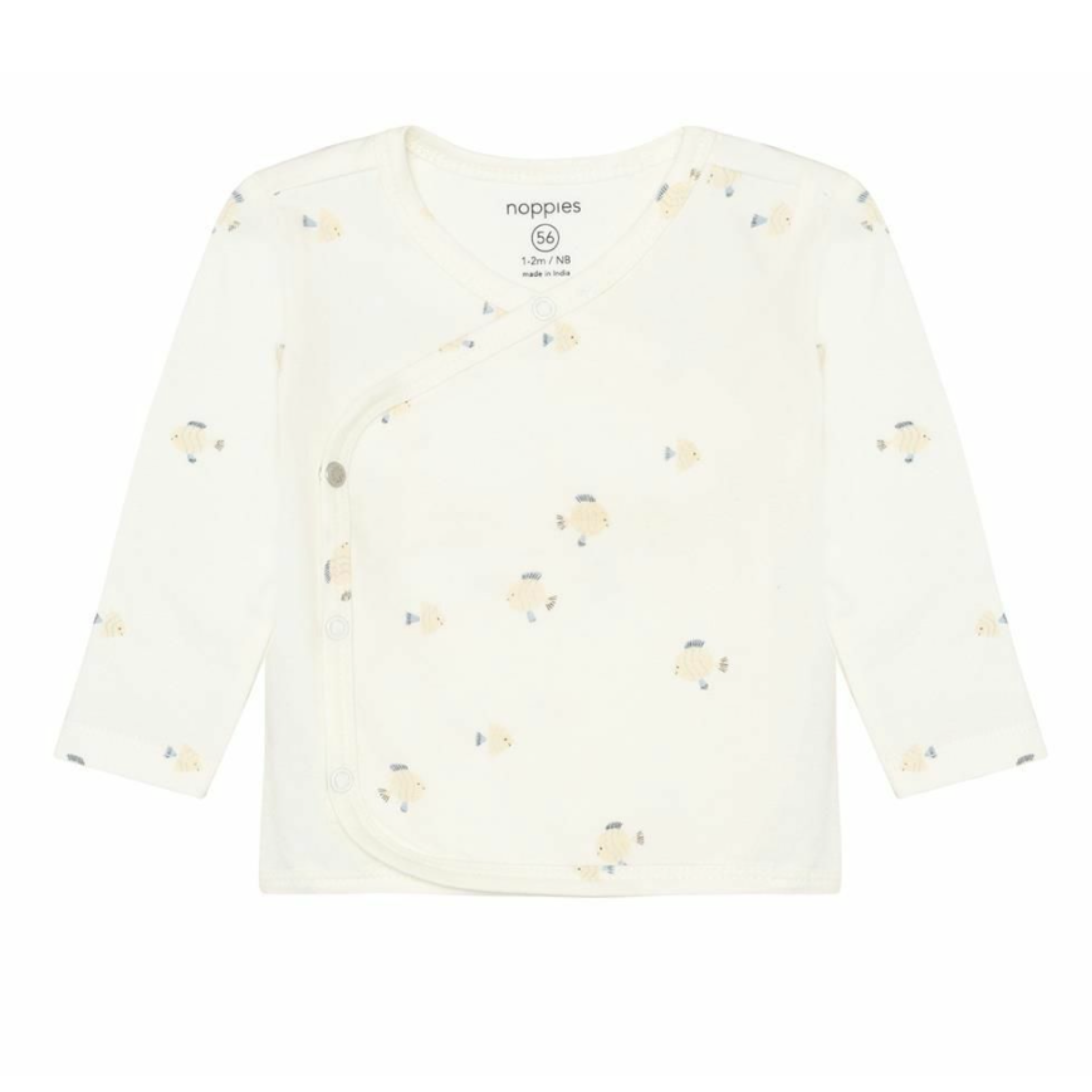 This Noppies Baby long-sleeved tee features a cheerful all-over fish print that brings instant joy. Made from stretch jersey organic cotton, it’s soft and flexible for all-day comfort. The V-neck and press-stud fastening make dressing especially easy, ideal for newborns. The wrap design at the bottom adds extra comfort and a snug fit. A playful essential for your baby’s first months. GOTS certified (CERES-0366), responsibly and sustainably made. Pairs perfectly with plain trousers or leggings.
