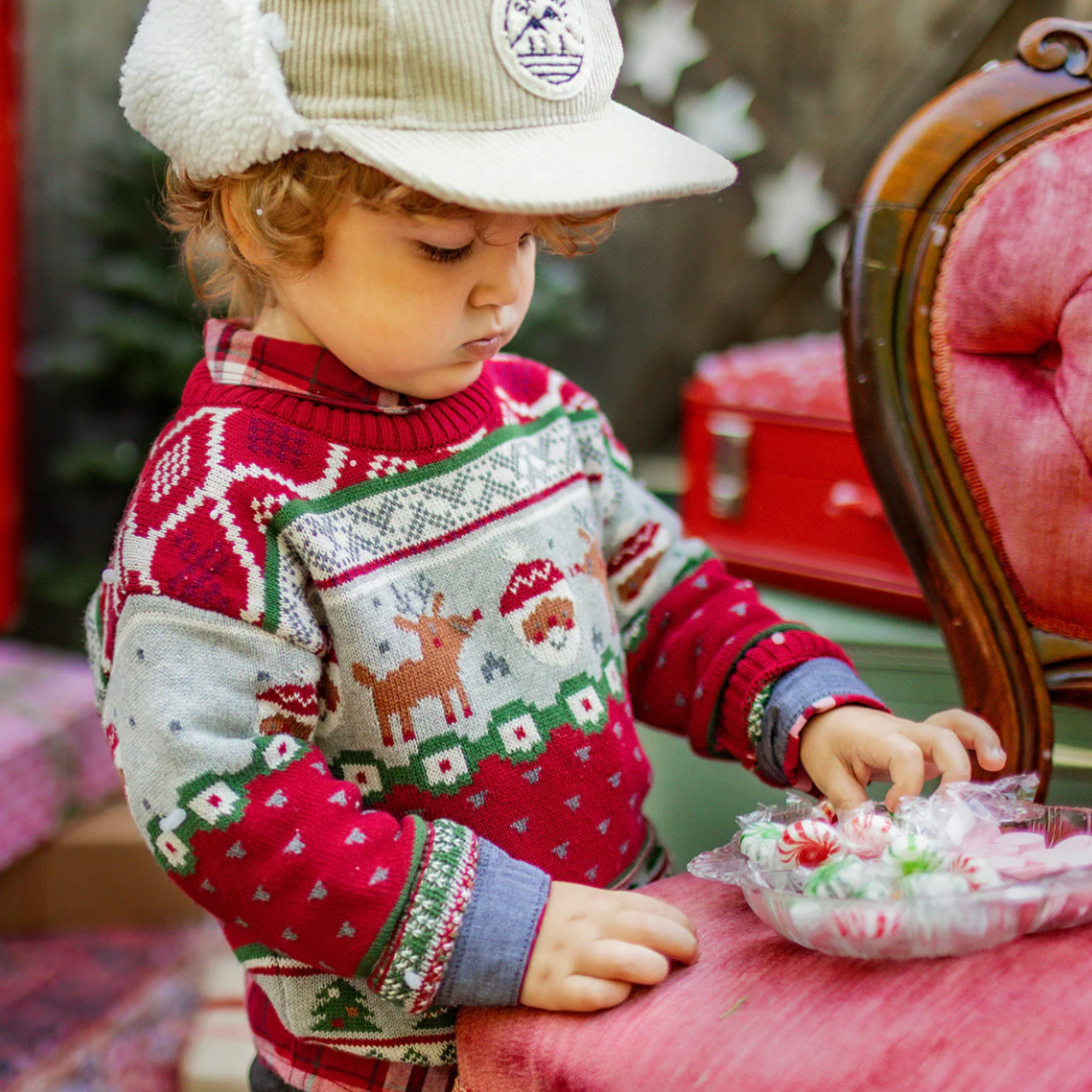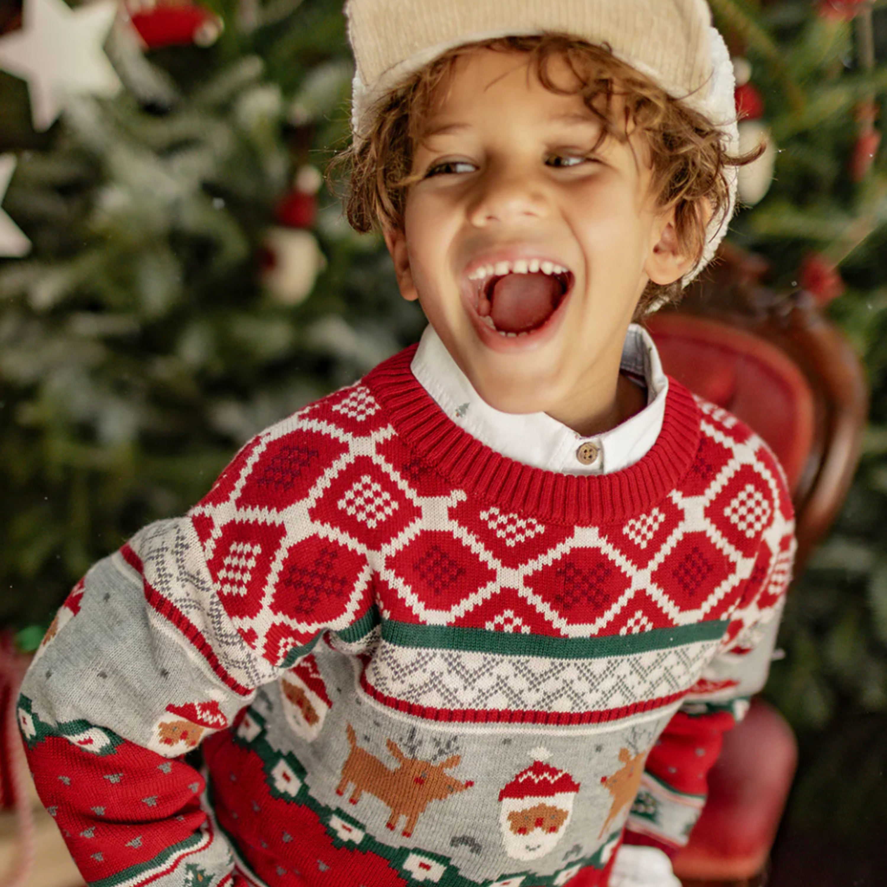 This red knitted sweater features cheerful festive patterns, perfect for embracing the holiday spirit. Designed with a ribbed round neckline, hem, and cuffs for a snug fit. Available in both kids' and adults' sizes for those who love twinning!