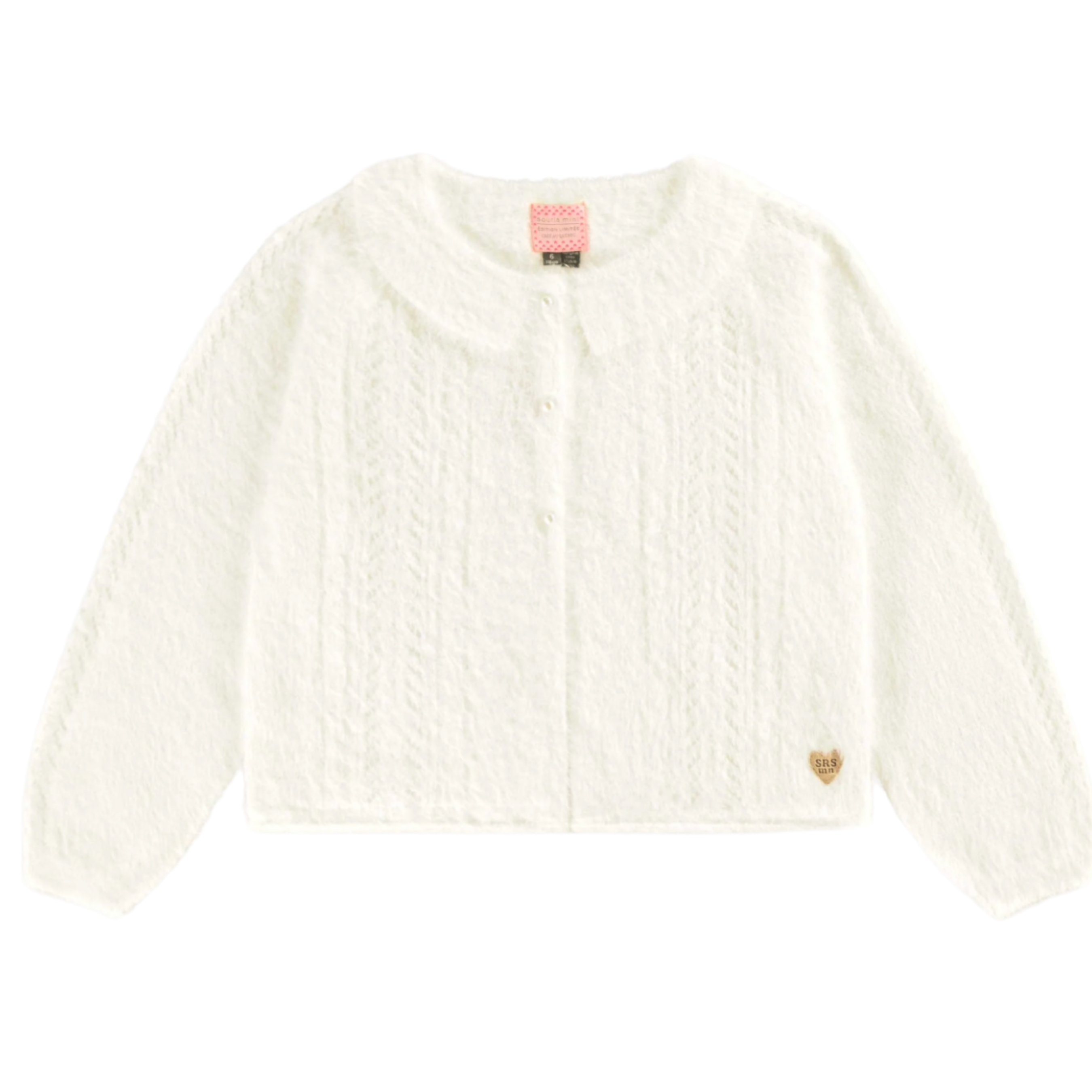 This fluffy white cardigan is irresistibly soft and charming. It features three pearl buttons that create a flared silhouette, a Peter Pan collar, and delicate pointelle details for an adorable and feminine look. The ribbed knit cuffs ensure a snug fit.
