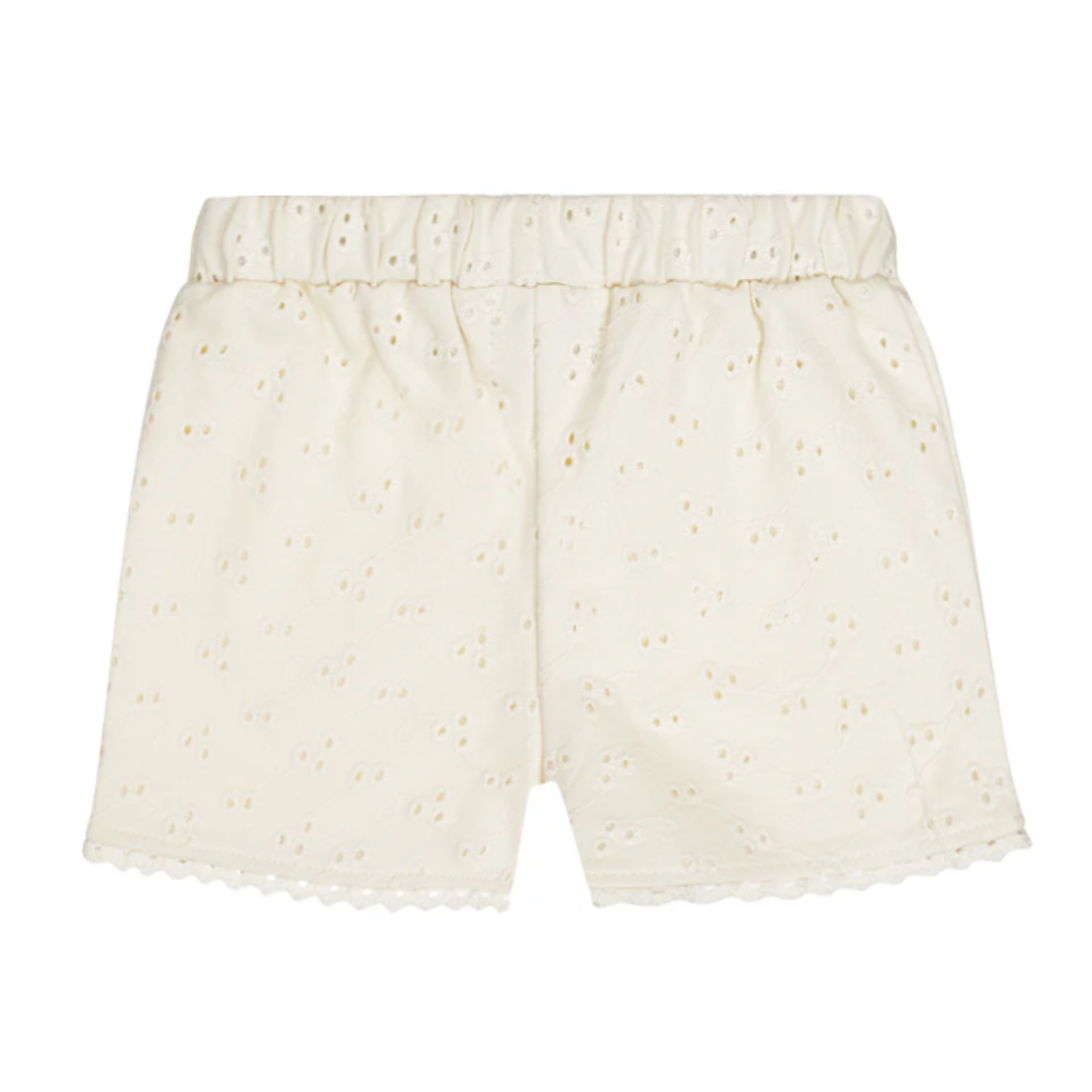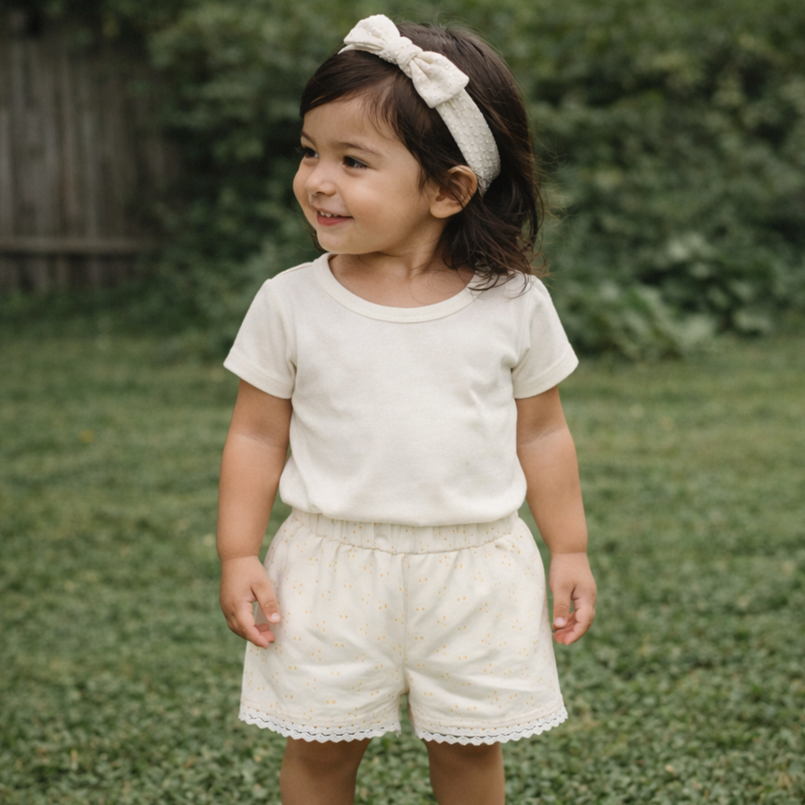 Adorable cream eyelet shorts perfect for warm weather play. Lightweight and breathable fabric keeps little ones cool and comfortable during summer adventures. The delicate eyelet detailing adds a sweet, feminine touch that pairs beautifully with any warm-weather wardrobe. Lined for extra comfort and durability. Ideal for beach days, picnics, or everyday wear when temperatures rise.
