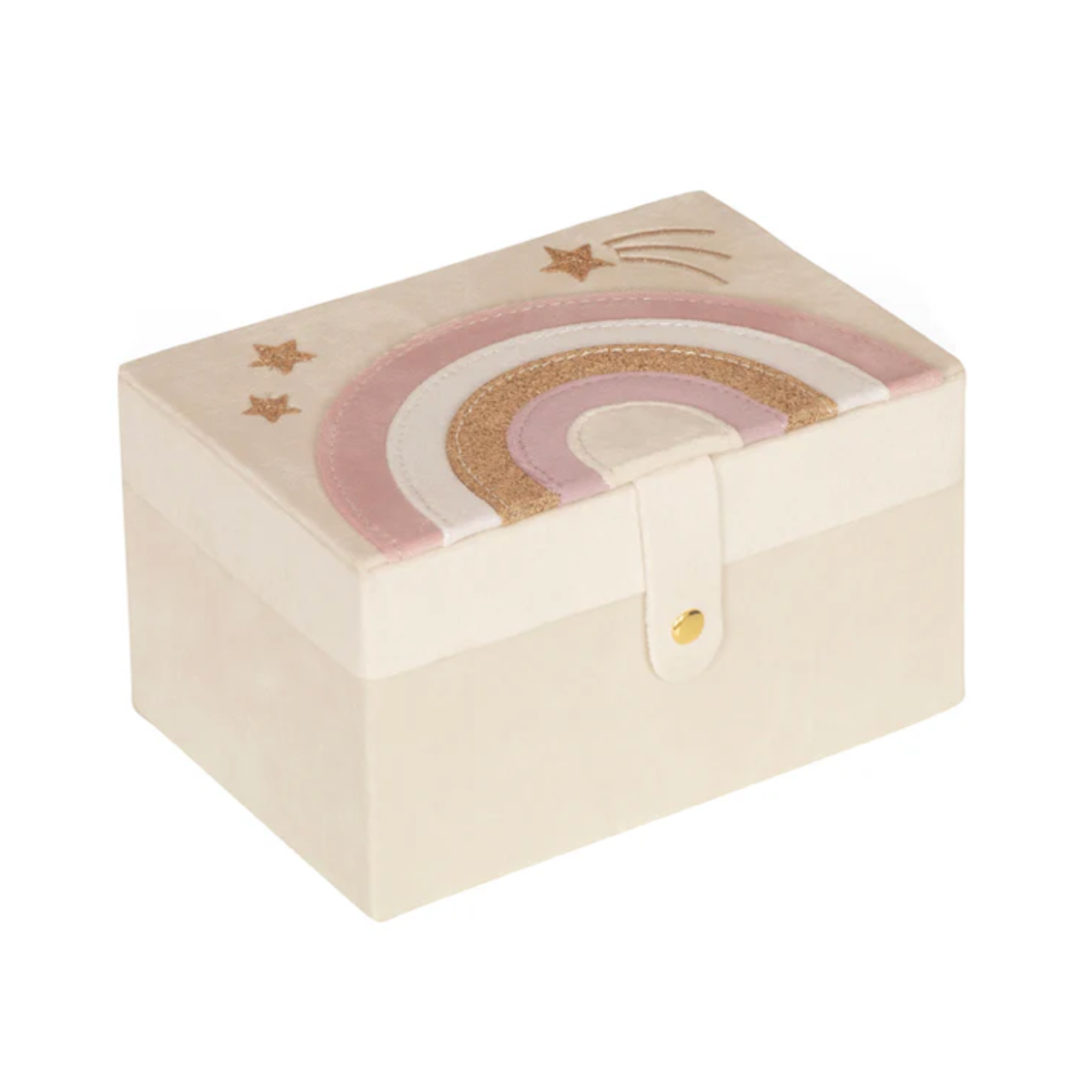 Featuring an enchanted rainbow in velvet and gorgeous glitter on top, with a shimmering gold shooting star. This jewellery box has a popper fastening to reveal a large compartment, with a removable tray, a slip pocket and a dedicated space to slot earrings and rings.