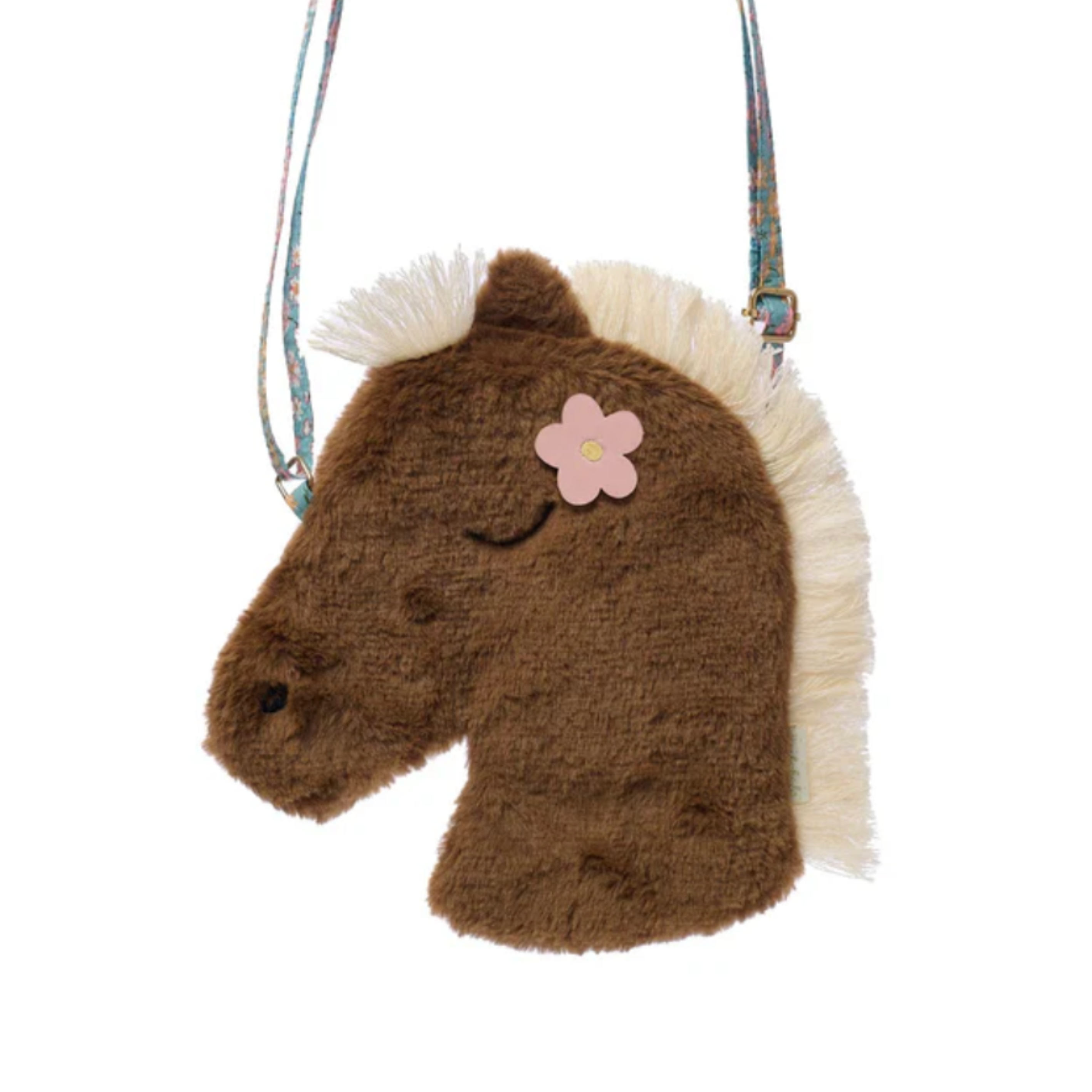 Giddy up Pony! Our Peggy Pony Bag is made from brown super soft faux fur with a sweet tuff mane and a little pink flower. This bag features a magnetic dot closure, our heidi floral fabric lining and adjustable strap with a break point for safety.