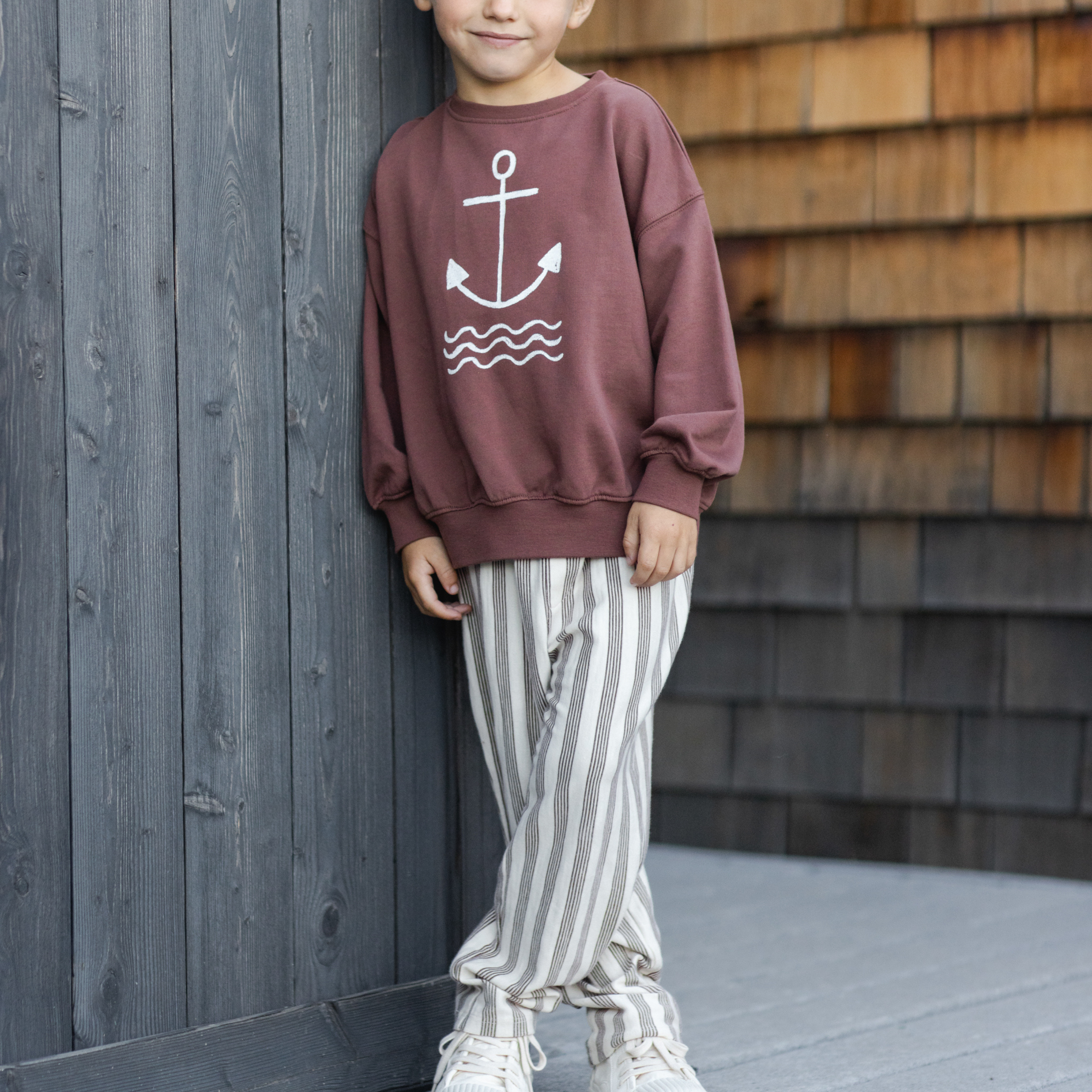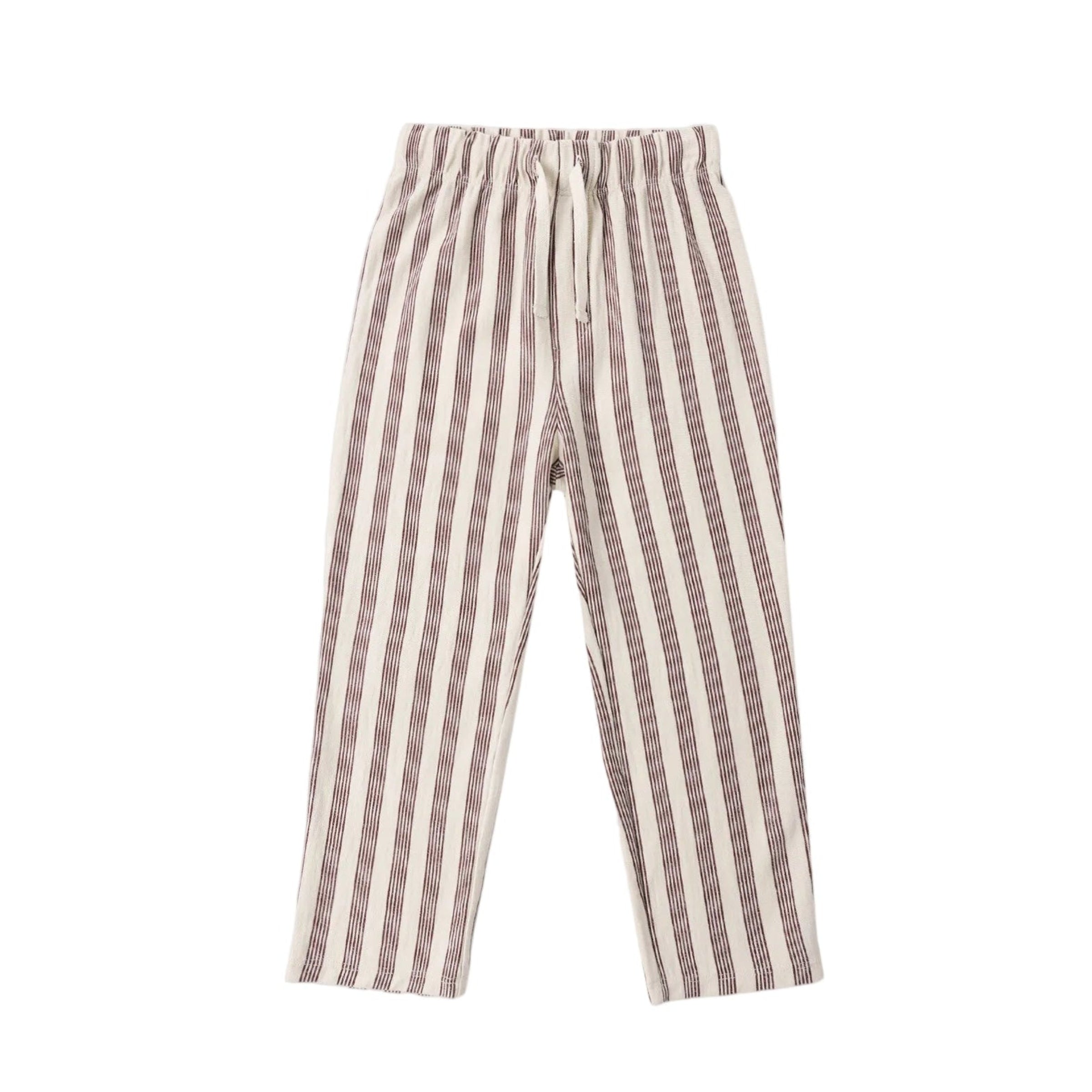 Meet your new go-to pair! The Rory Brown Stripe Pant brings effortless style and all-day comfort to your wardrobe. Crafted from soft 100% cotton with a charming brown stripe pattern, these drawstring waist pants are perfect for lounging, playing, or just keeping things casual. The relaxed fit and adjustable waist make them a breeze to slip on and move around in. Just toss them in the wash on cold, tumble dry low, and you're set for another round of adventures. Simple, comfy, and oh-so-fun!