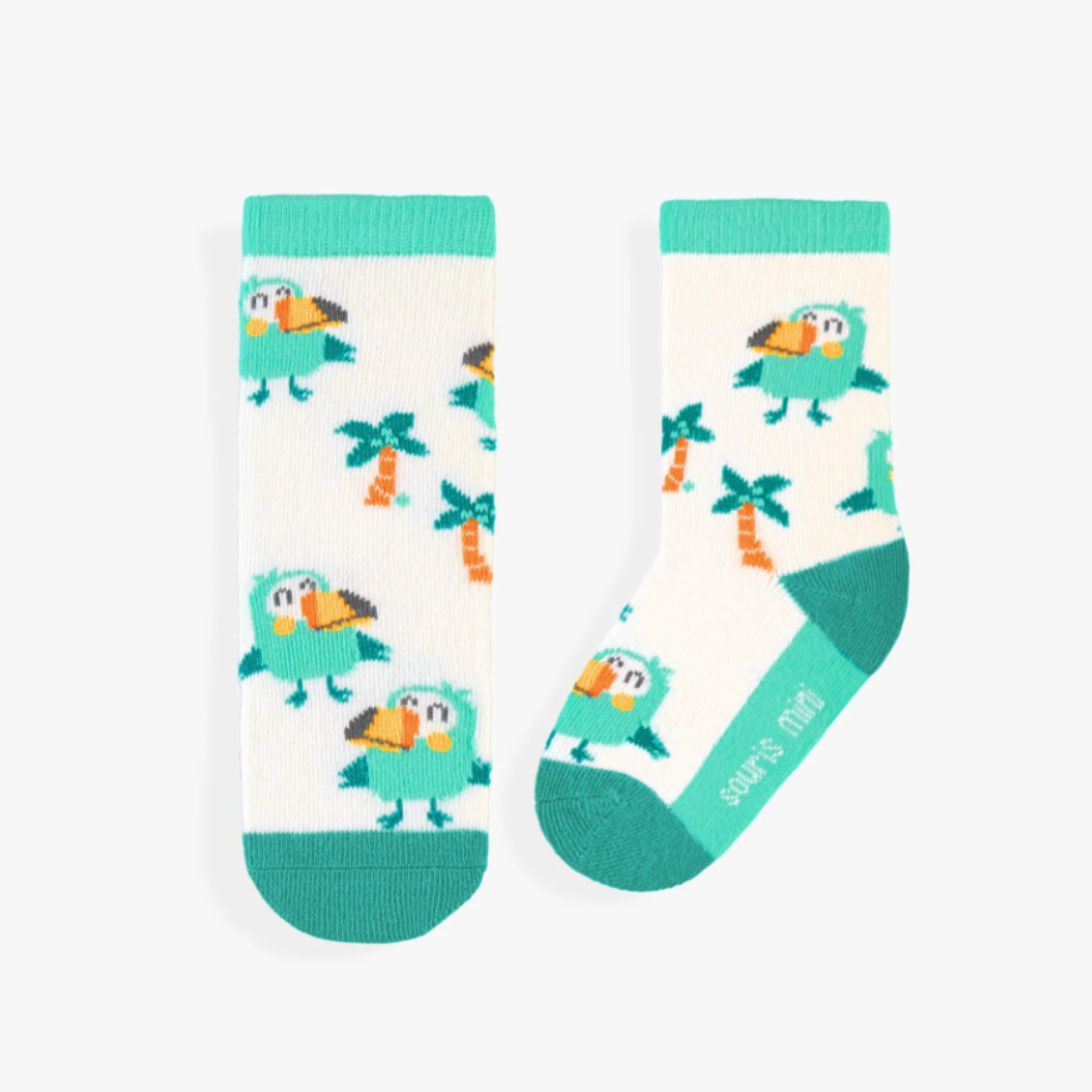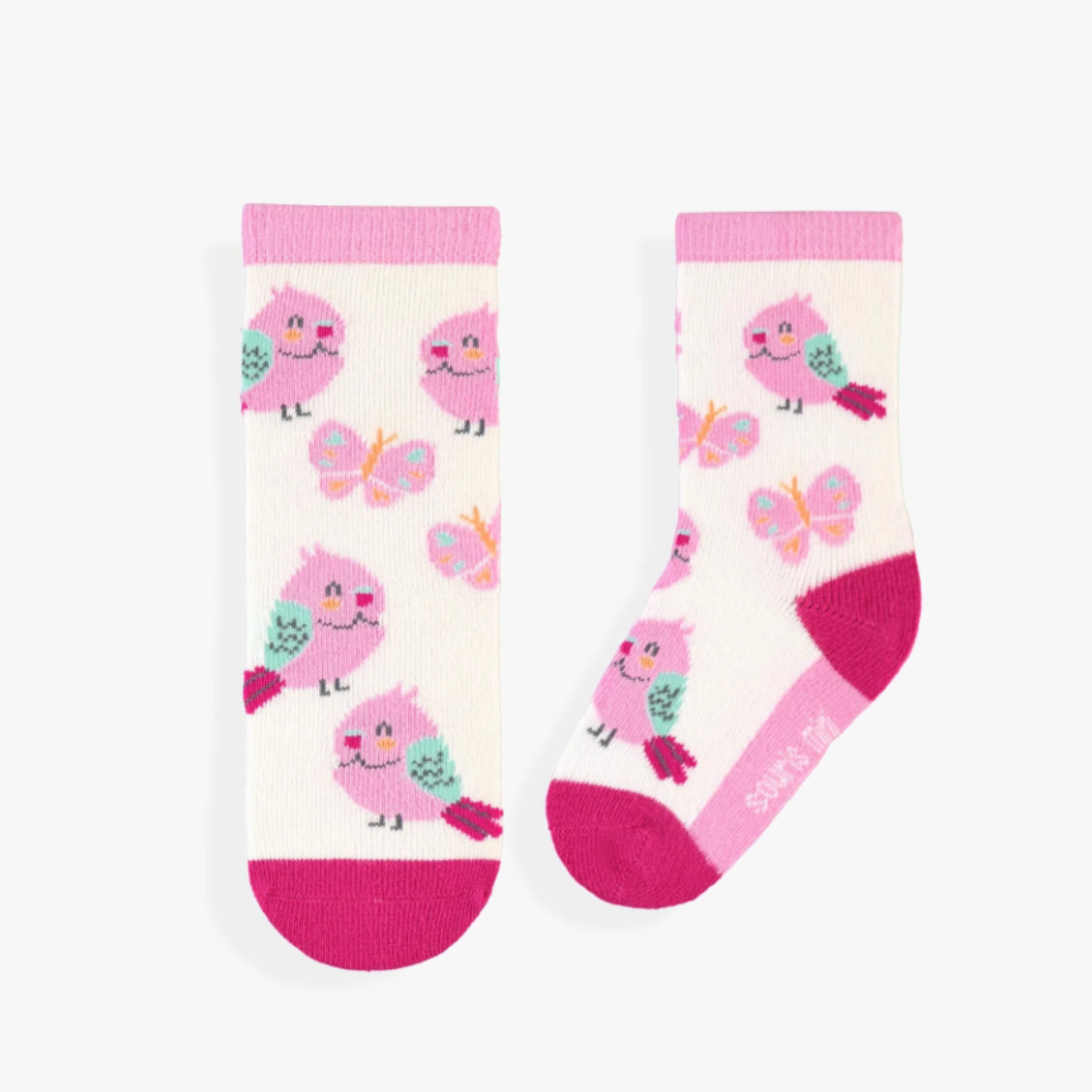 Cream socks with adorable bird and butterfly patterns. The heel and toes are reinforced for added durability. Made from a comfortable and stretchy fabric.