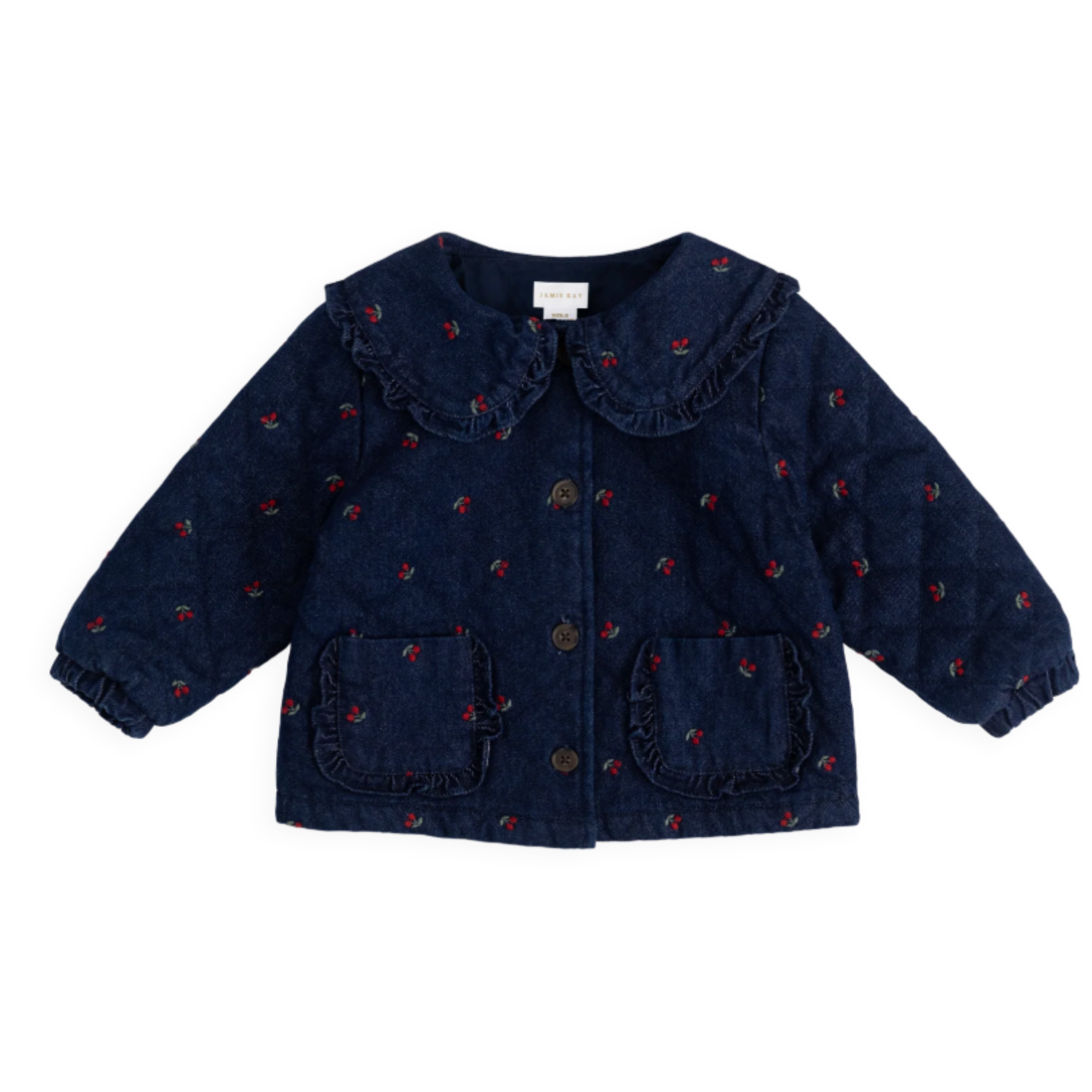 Crafted from 100% Cotton, this denim blend offers breathability and gentle stretch for comfort and movement. Dyed in rich tones and finished with nickel-free metal accessories, it’s as safe as it is stylish. The ruffle neckline and front patch pockets complete the look with Jamie Kay’s signature dainty detailing.