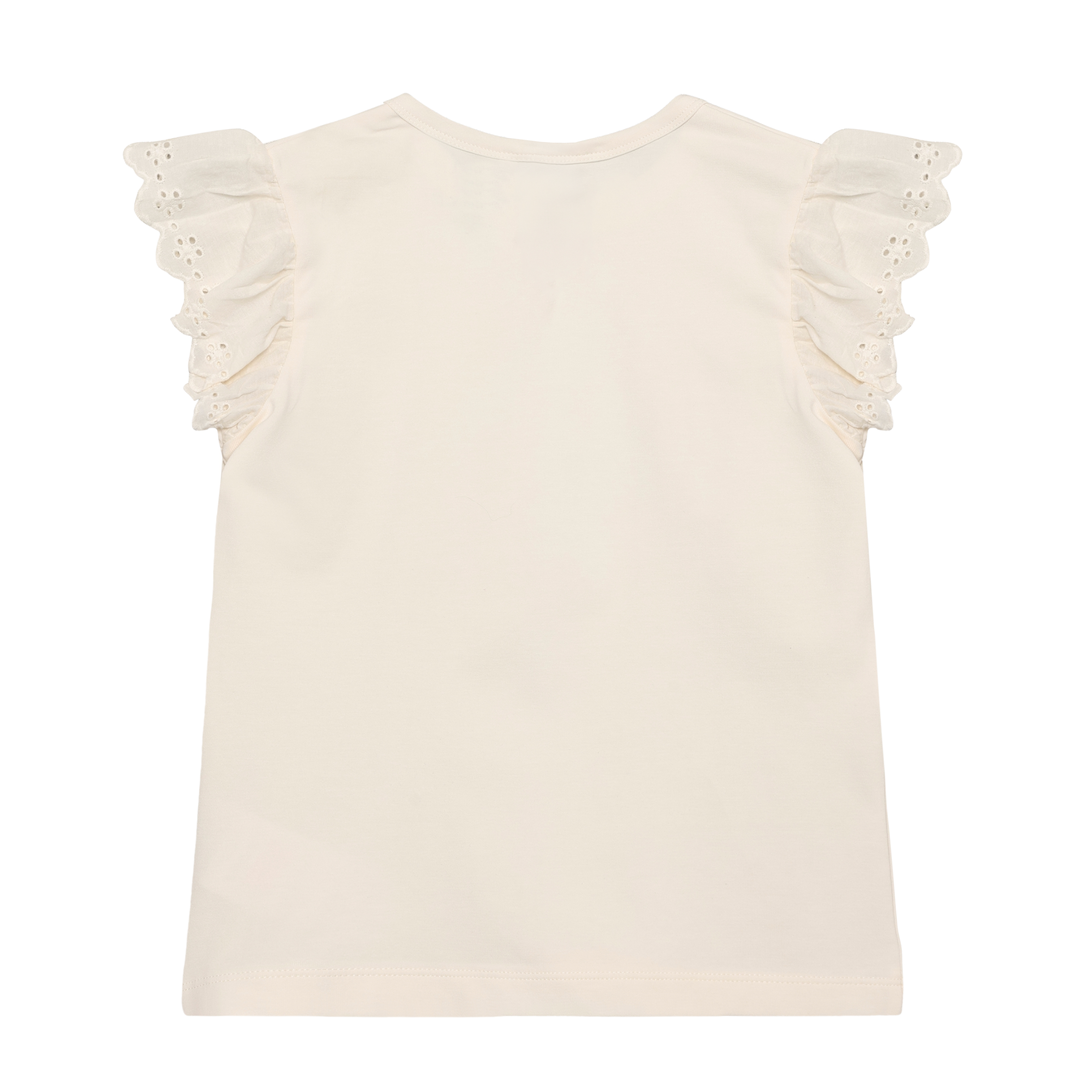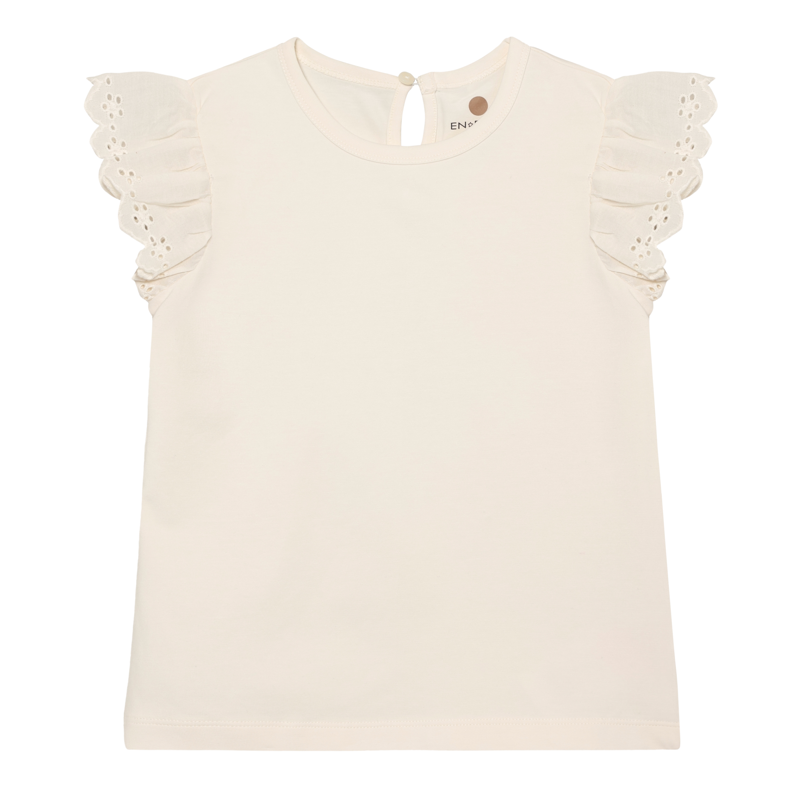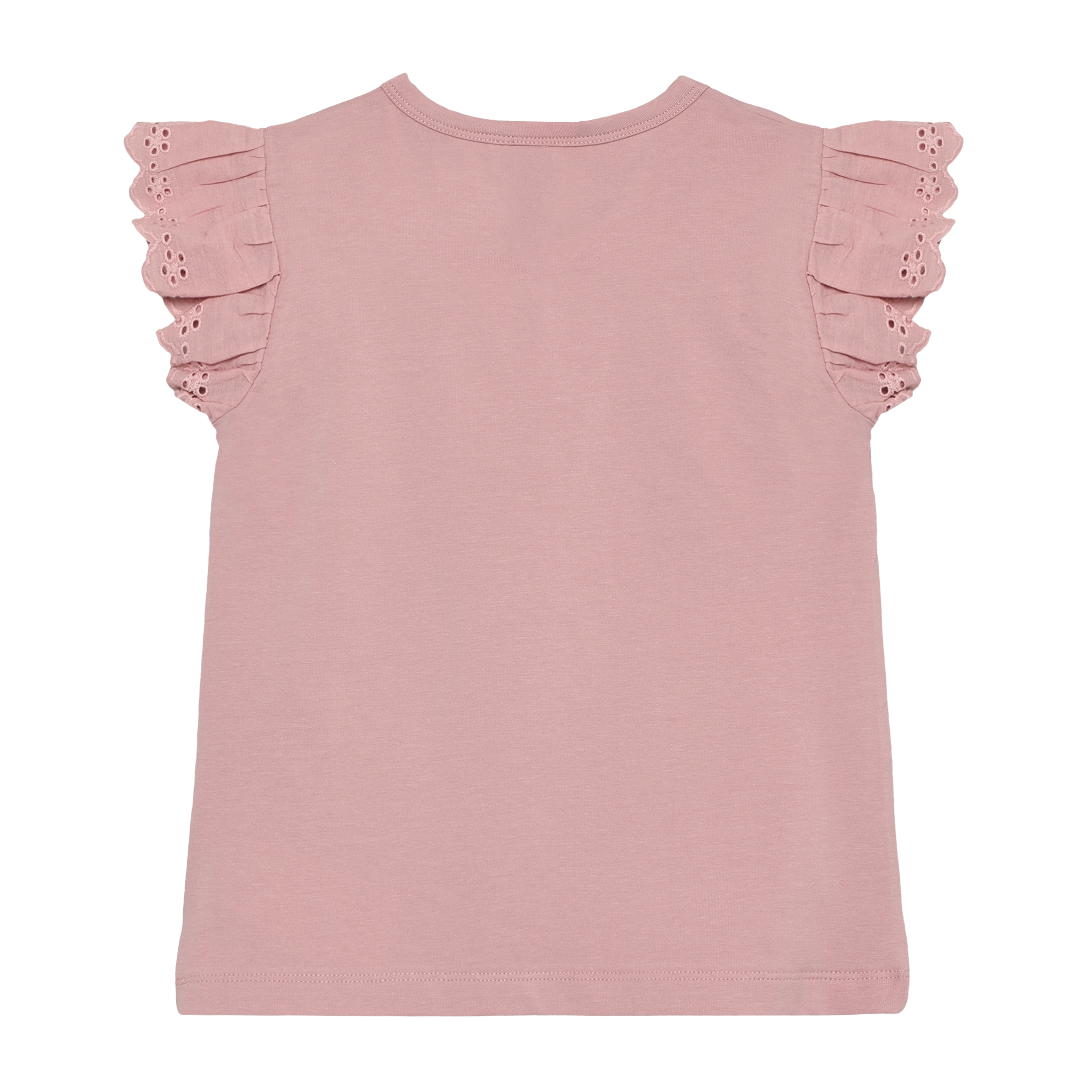 Soft and sweet, this girls' t-shirt features delicate ruffle sleeves trimmed with charming eyelette details. Crafted from 100% cotton, it's breathable and comfortable for warm weather play. Available in timeless Oat and pretty pink, this versatile top pairs effortlessly with any outfit in her wardrobe.