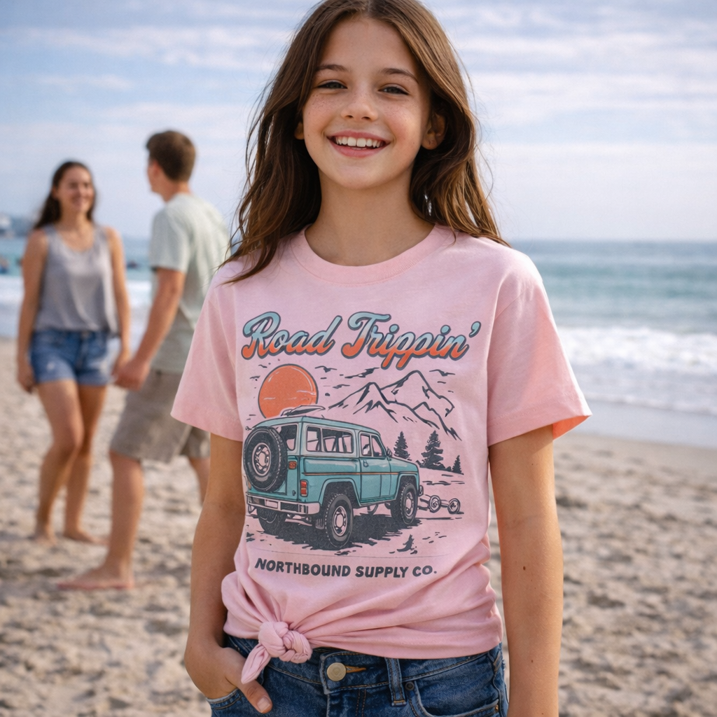 Hit the road in style with this lite pink youth tee featuring a bold jeep graphic and "Road Trippin'" text on the front. Perfect for adventure-loving kids who dream of exploring new places, this comfortable tee combines eye-catching design with everyday wearability. Ideal for casual outings, road trips, or showing off that wanderlust spirit.