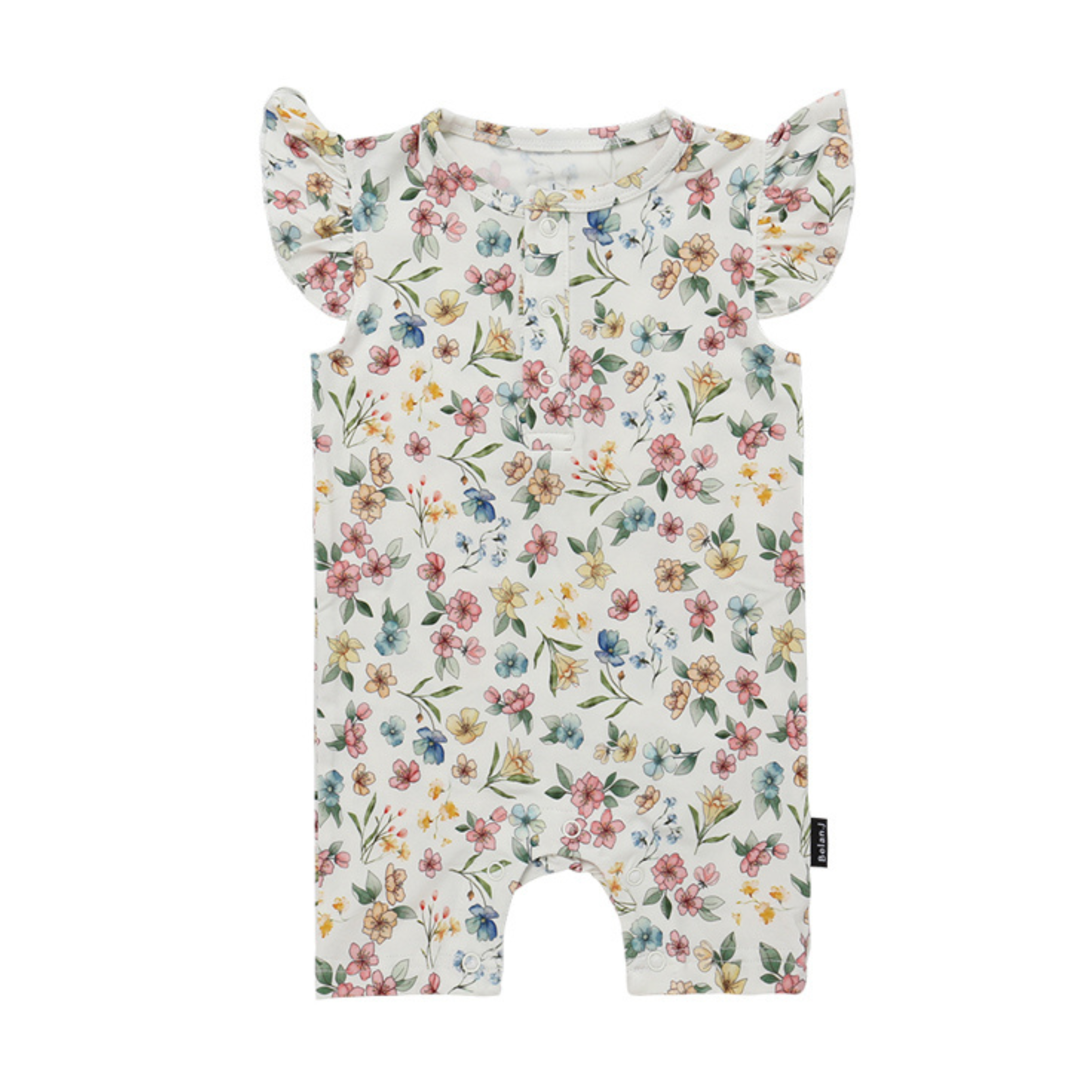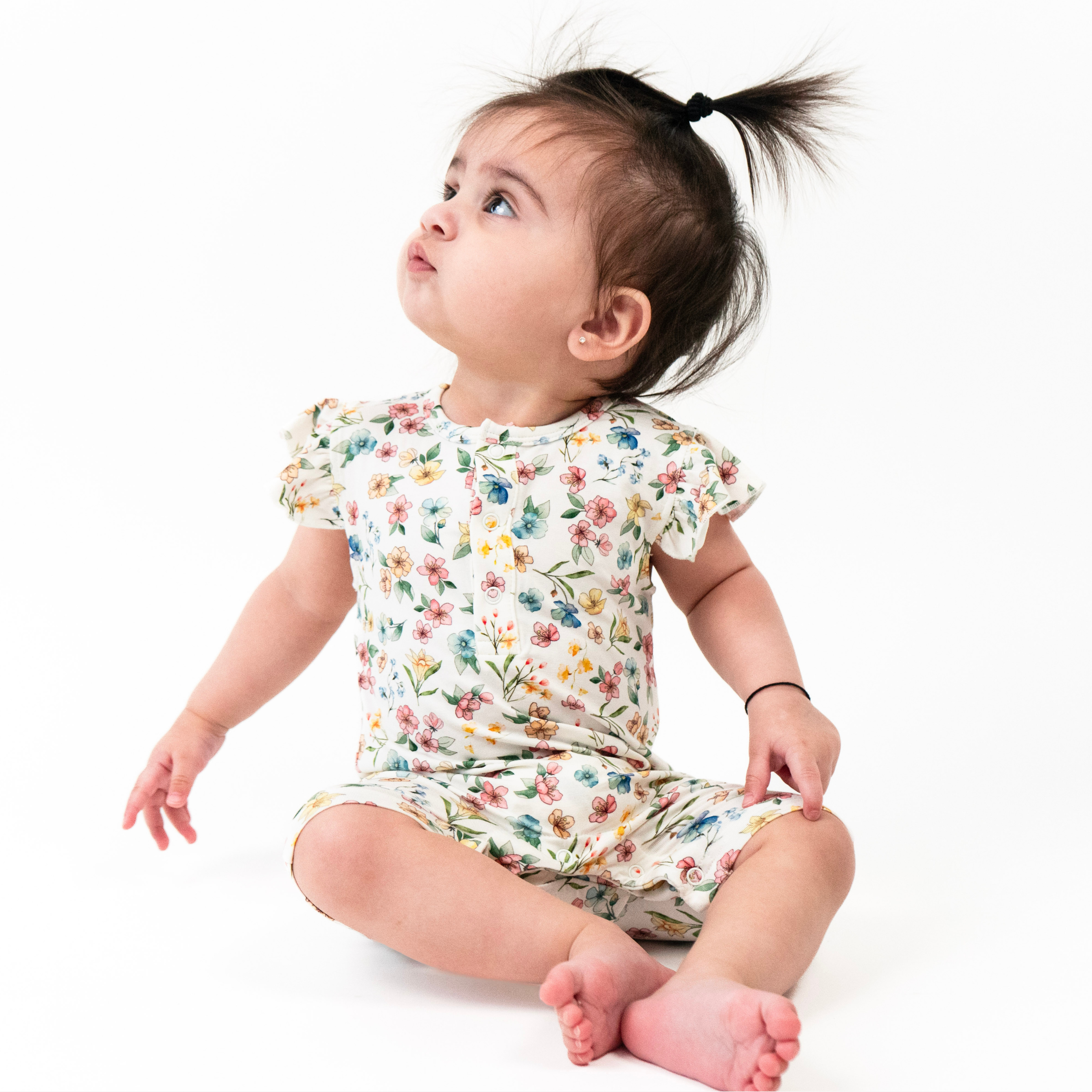 A feminine take on our classic shortall romper! Crafted in our ultra soft, breathable bamboo rayon, this ruffled sleeve romper is the ultimate daywear style for spring/summer. Snaps at bottom make for easy dressing and diaper changes.