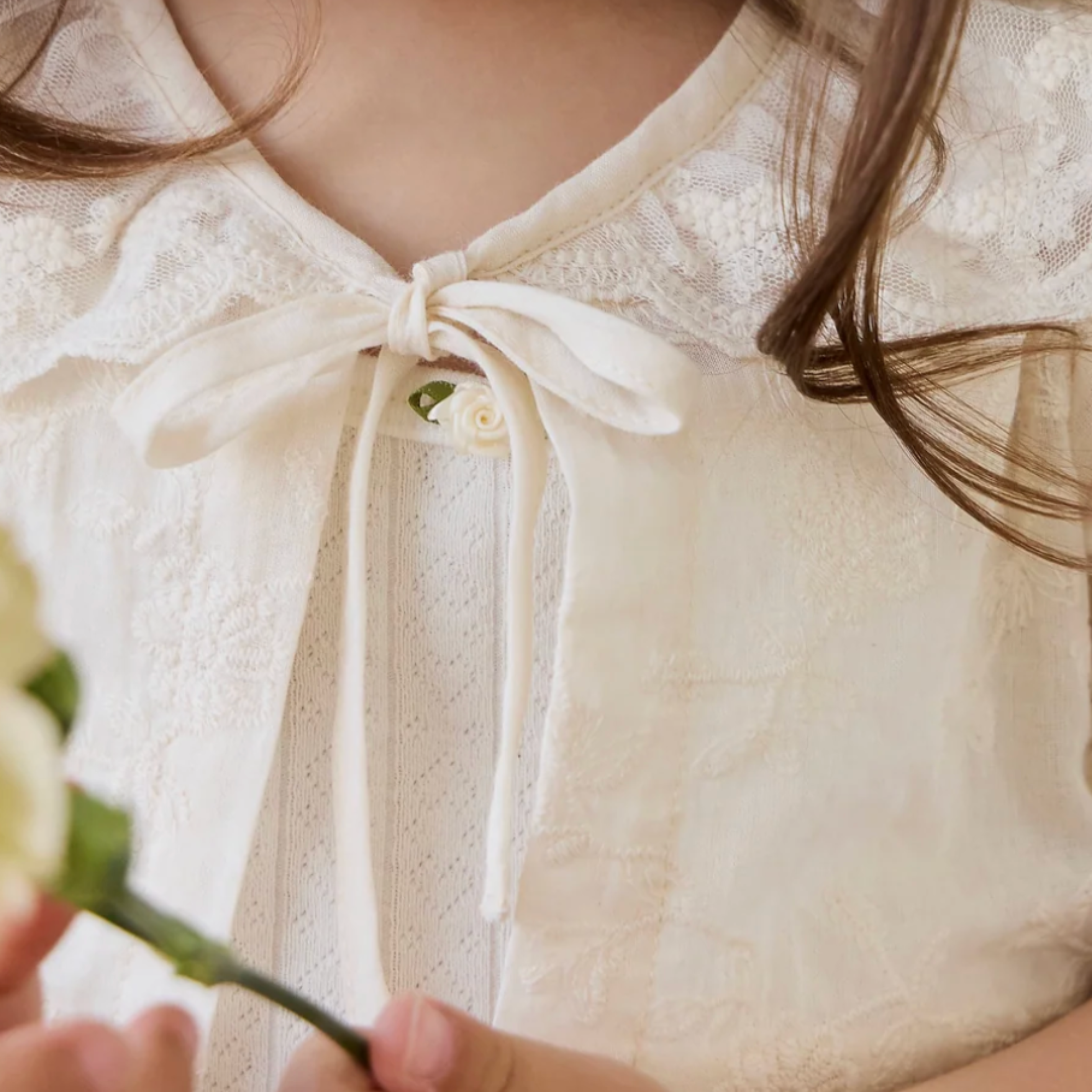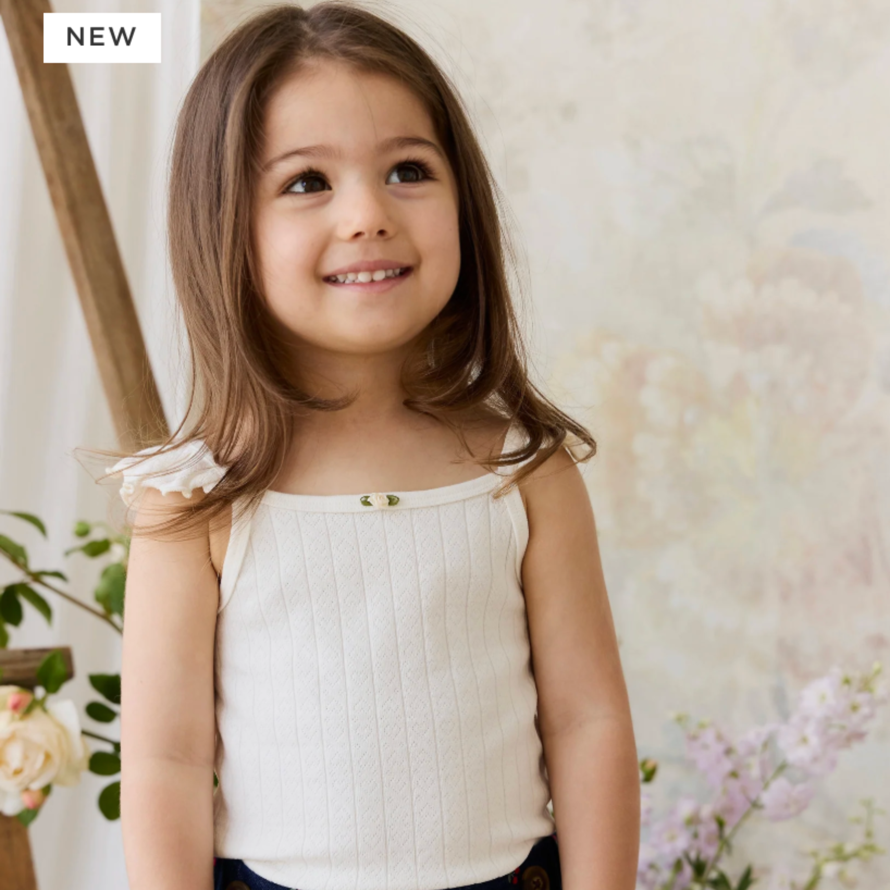 Add a touch of delicate charm to your little one’s wardrobe with our Josephine Singlet in Sweet Heart Pointelle Parchment. Featuring flutter straps and a dreamy pointelle heart design, this piece is perfect for layering or wearing on its own for a timeless, vintage-inspired look.